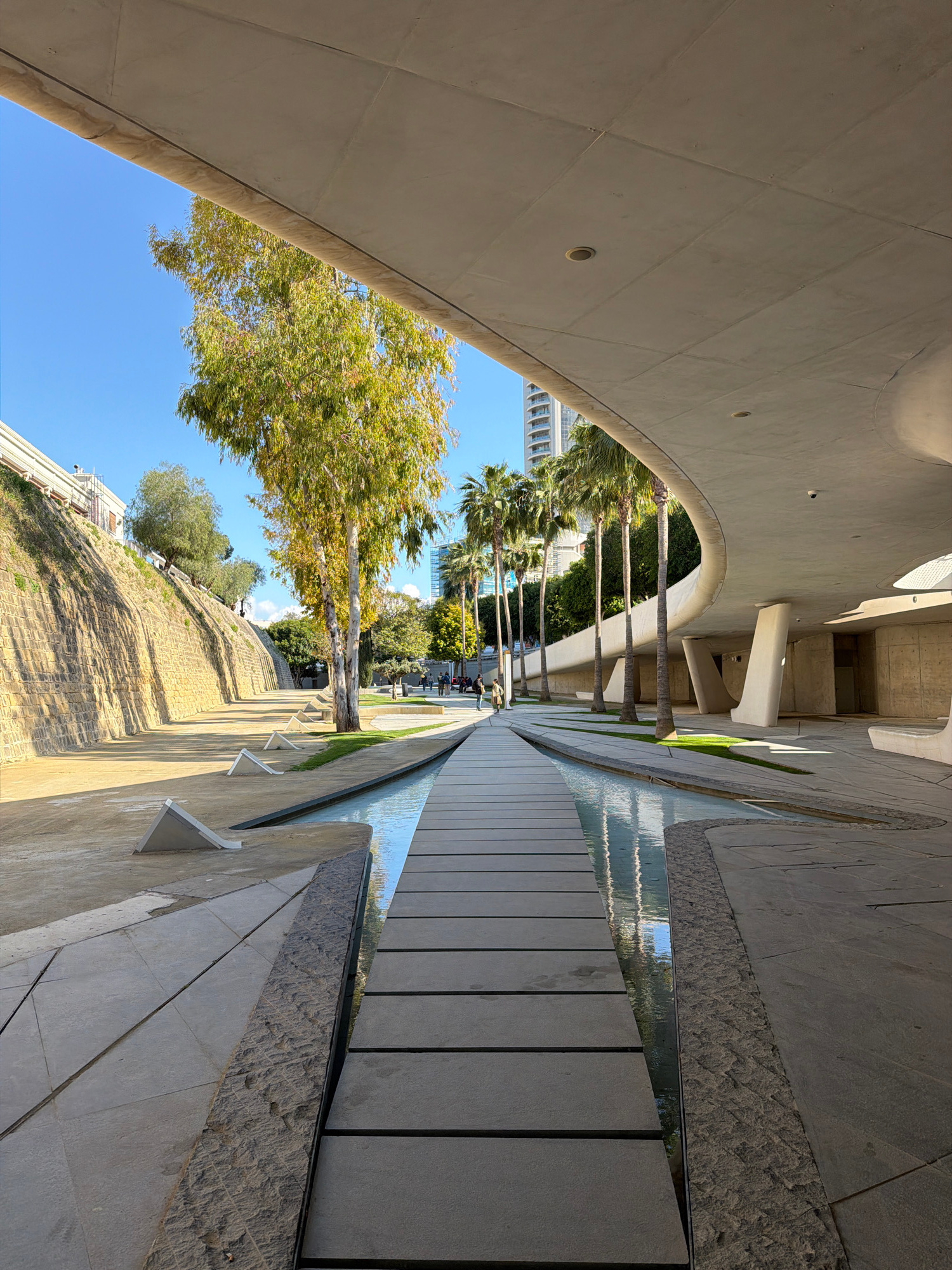 Captured from a low angle, the image reveals an urban landscape in Nicosia, Cyprus. A monumental concrete structure with a sweeping arch frames the composition. Underneath this structure, palm trees…read more