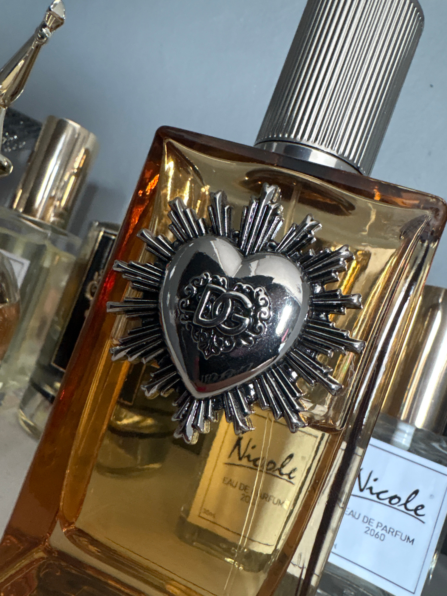 A close-up, slightly high-angle shot focuses on the top of a bottle of "Nicole" eau de parfum, with other perfume bottles blurred in the background. The "Nicole" bottle is filled with amber-colored li…read more