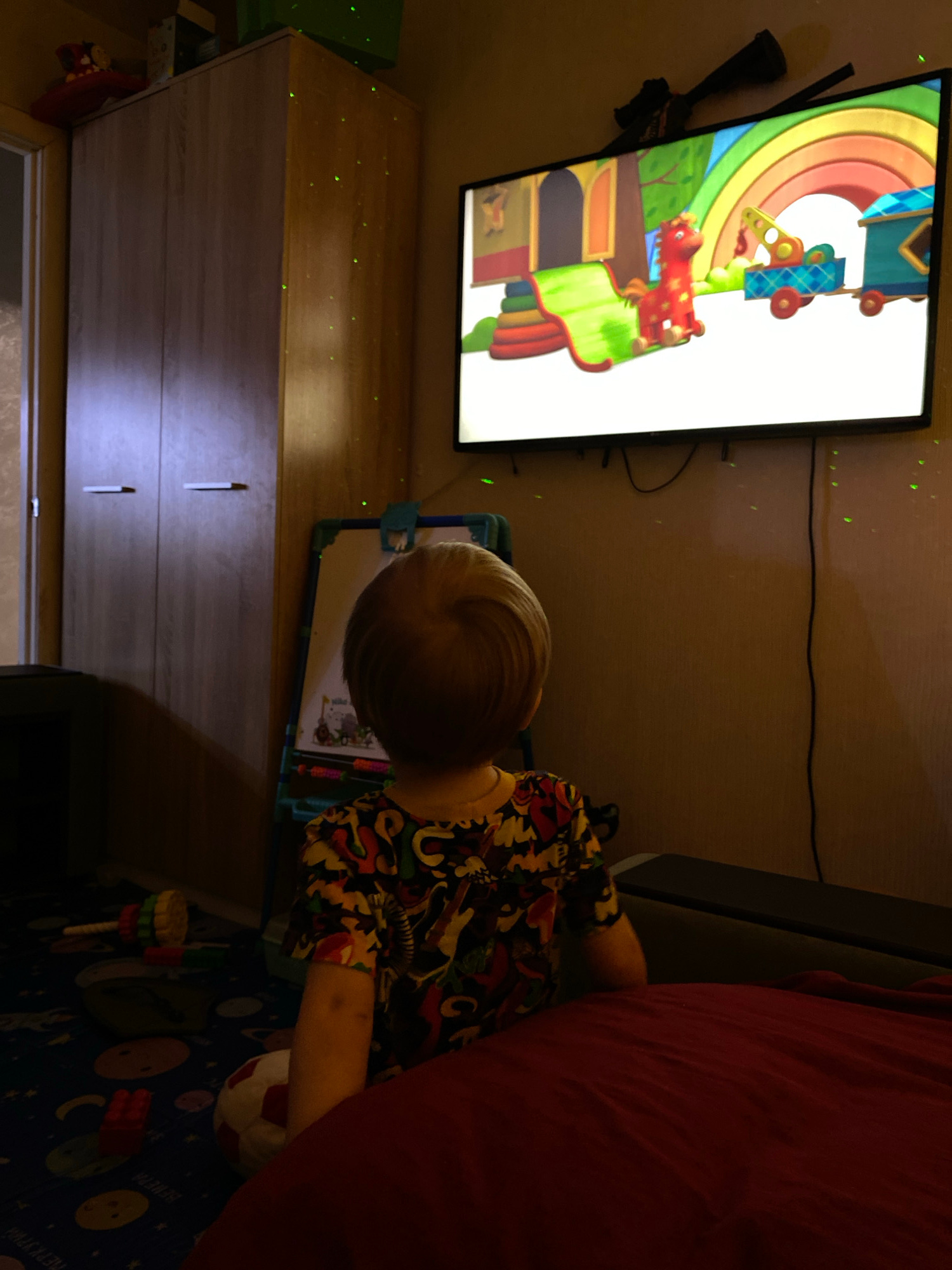 A young child is seated, facing a television screen displaying animated content. The child is wearing a multicolored shirt. The television is mounted on a wall above a wooden cabinet. The surrounding…read more
