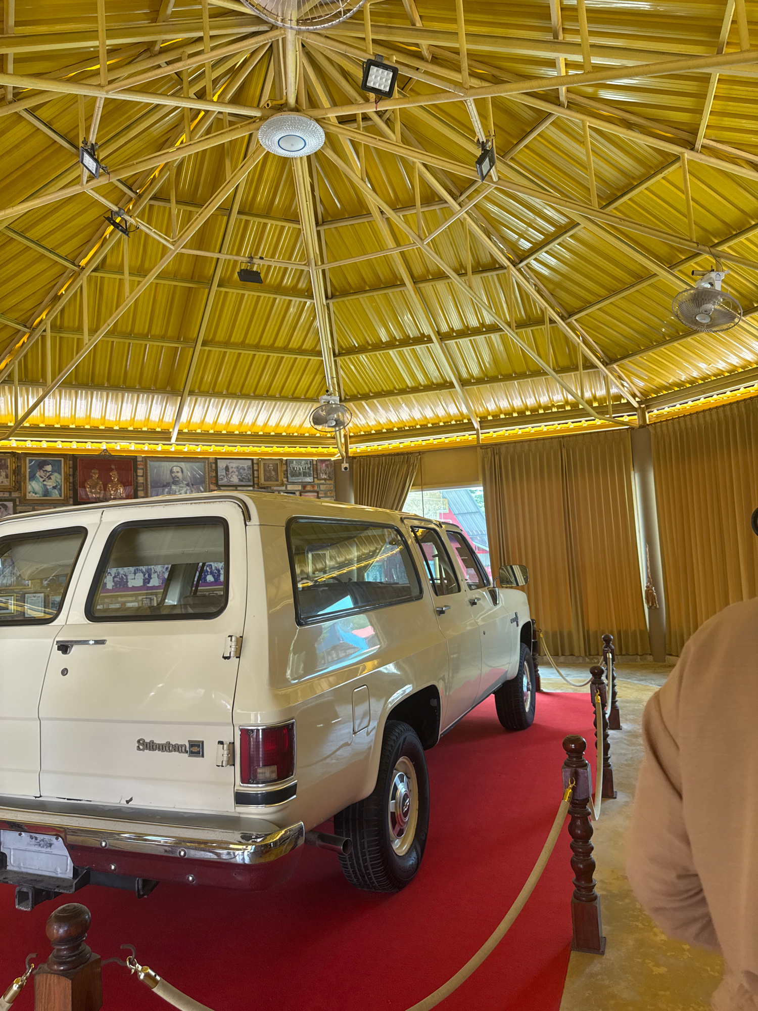 The image shows the interior of a building in Ban Khlong Khian, Thailand, featuring a yellow, radial-patterned metal roof structure with lights and fans. Below the roof, a cream-colored Chevrolet Subu…read more