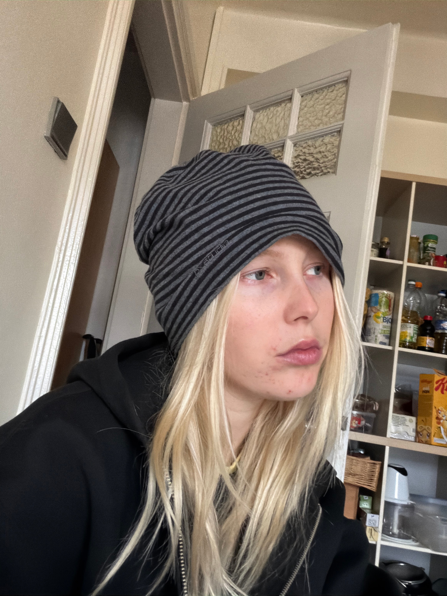 A close-up, slightly angled photograph shows a person with fair skin and blonde hair wearing a striped grey and black beanie and a black zippered jacket. The person's face is partially obscured by the…read more