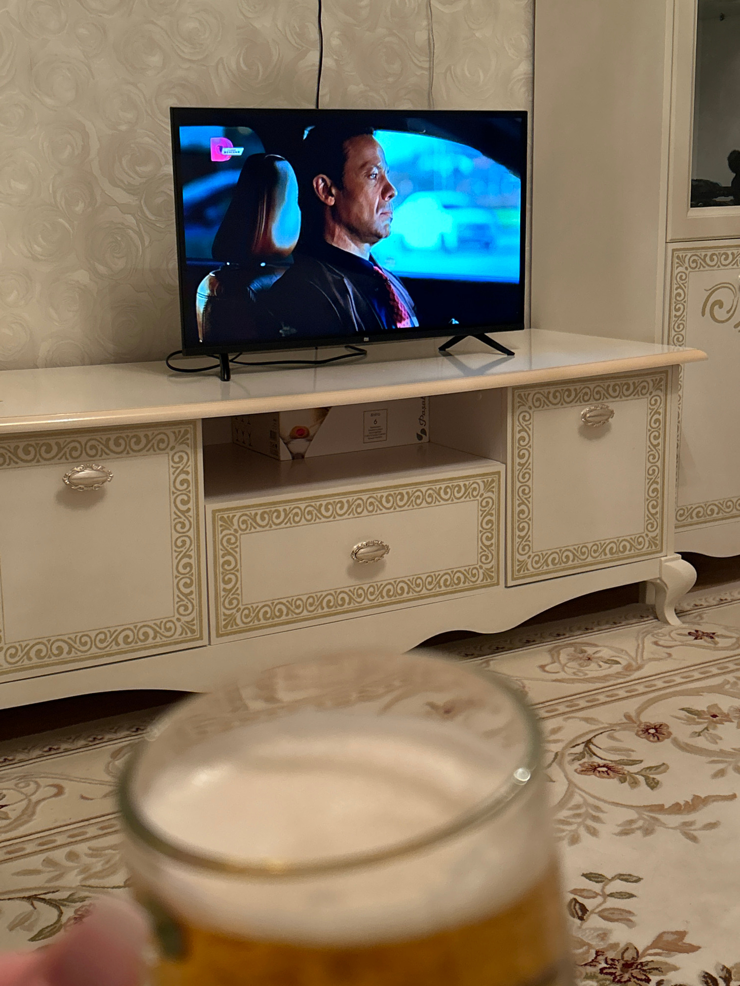 The image depicts an indoor scene. A television displaying a man lies against a wall covered in floral wallpaper. Adjacent to the television is a white cabinet with ornamental detailing and silver han…read more
