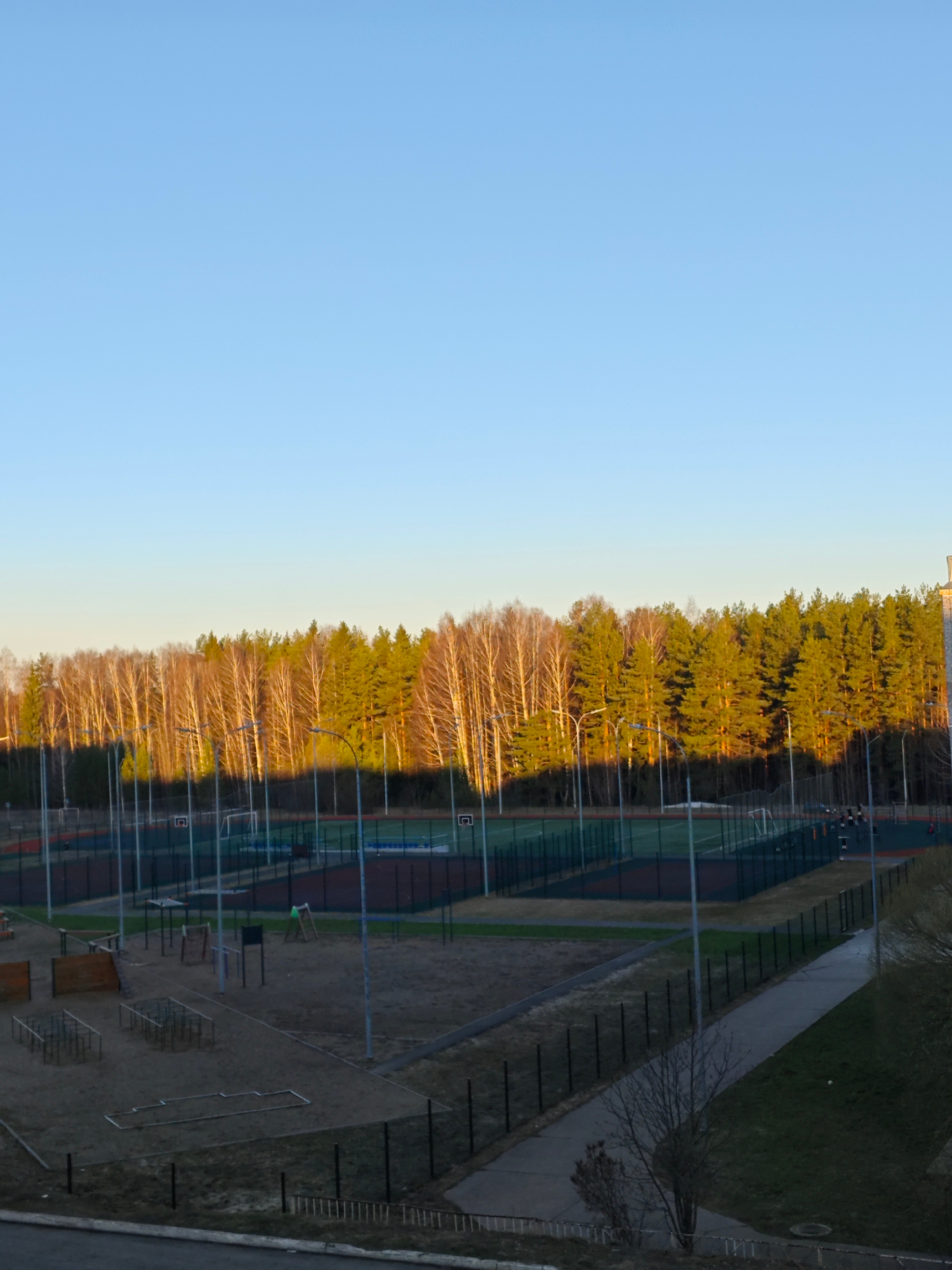 The image depicts an outdoor sports and recreation area in Markovskii, Russia. In the foreground is a sandy playground with metal climbing structures. Beyond this, several fenced-in sports courts are…read more