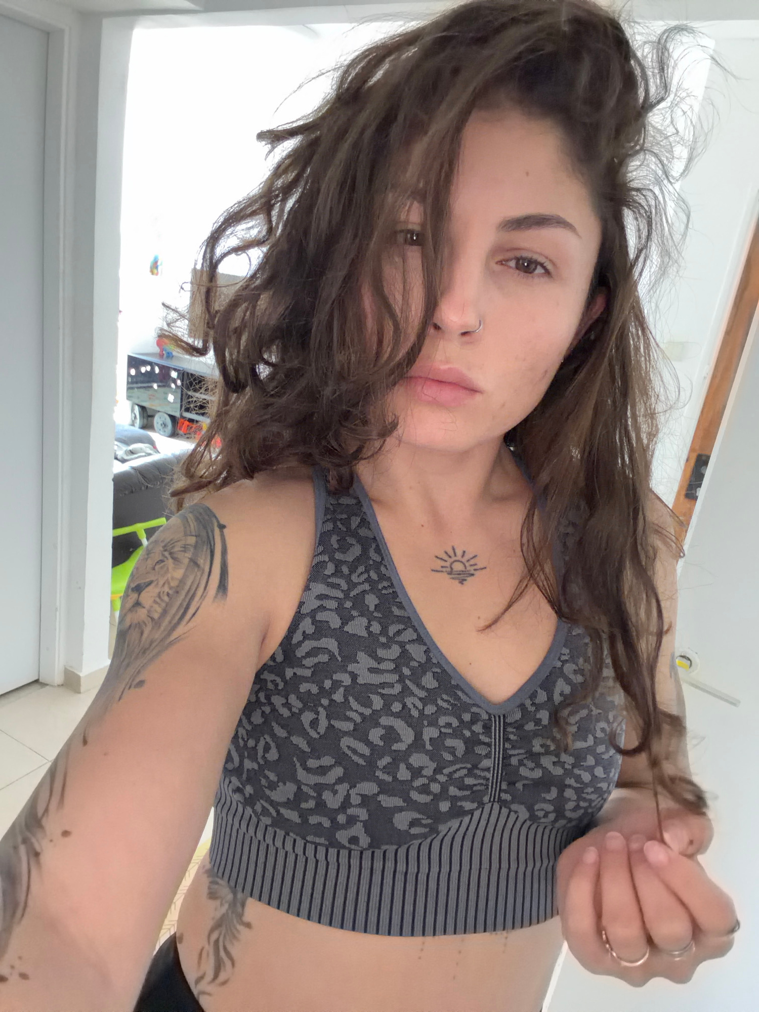 A young woman with brown hair and a nose piercing is posing for a selfie. She is wearing a gray patterned sports bra with horizontal stripes at the bottom. She has a tattoo of a sun or sunrise on her…read more