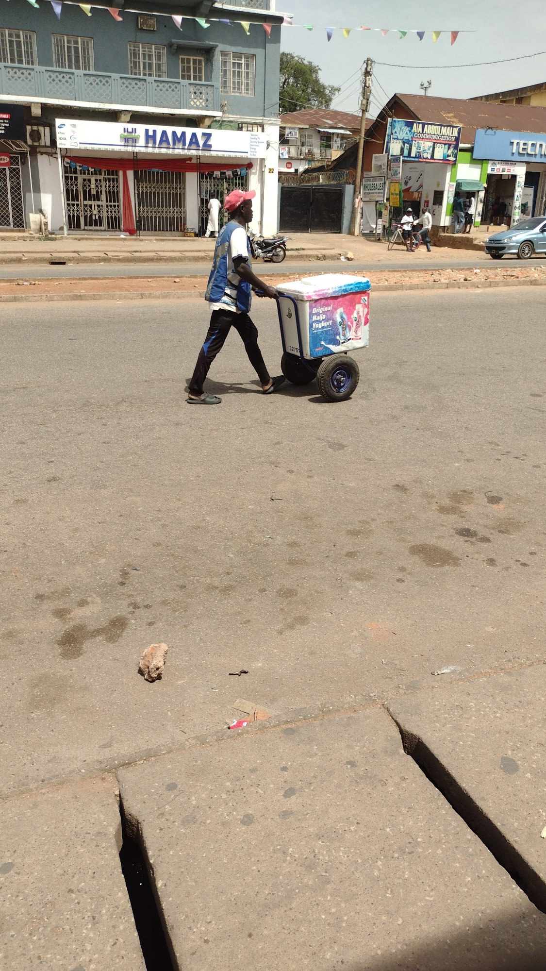 A street scene in Jos, Nigeria, shows a man pulling a cart with a cooler, labeled "Original Nija Yogurt." The street is paved and shows signs of wear and discoloration. Buildings line the street on onβ¦read more