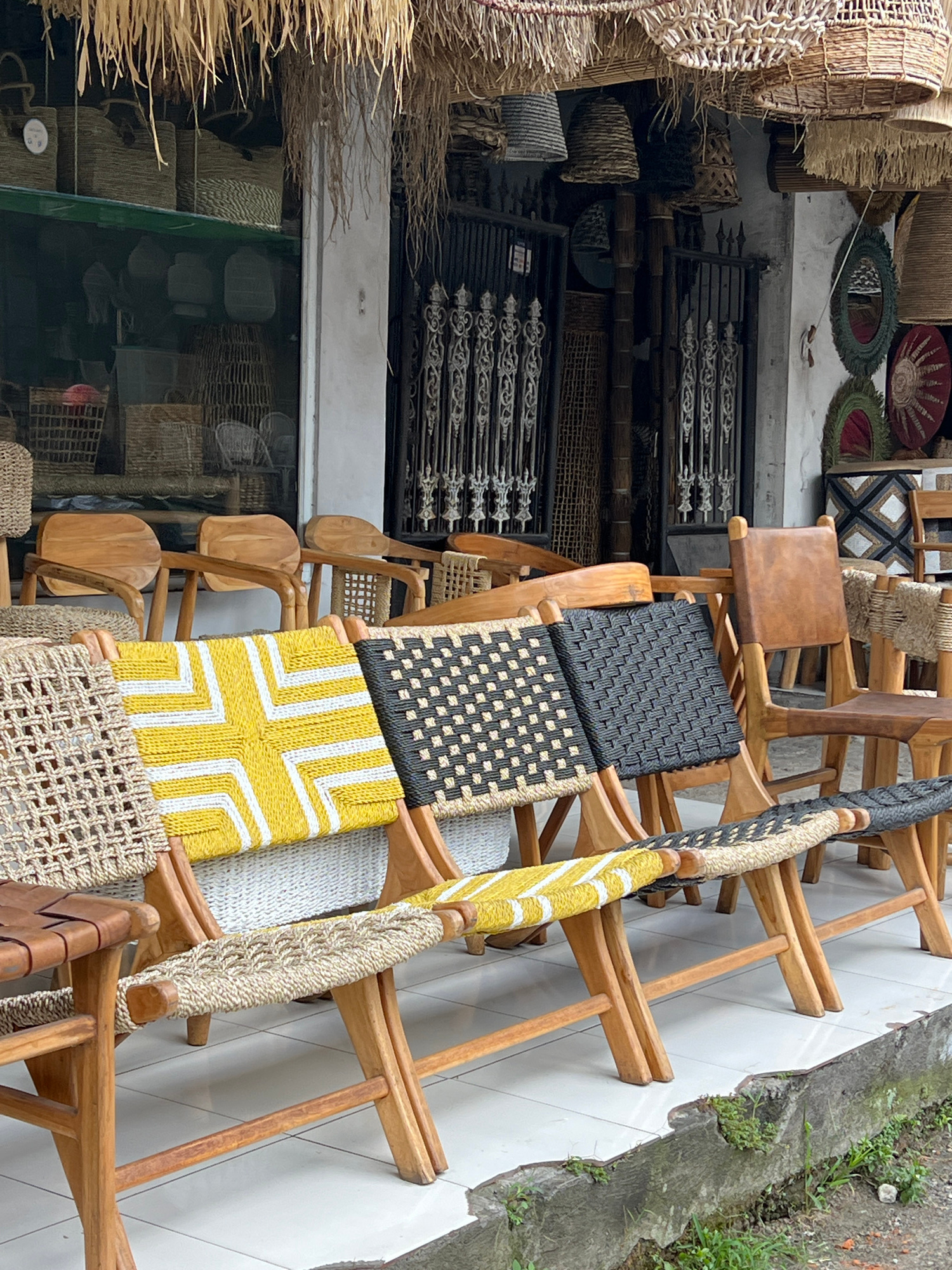 This image captures a vibrant display of handcrafted furniture and decor items, likely within a retail space or workshop in the Ubud District of Indonesia. The scene is dominated by numerous wooden ch…read more
