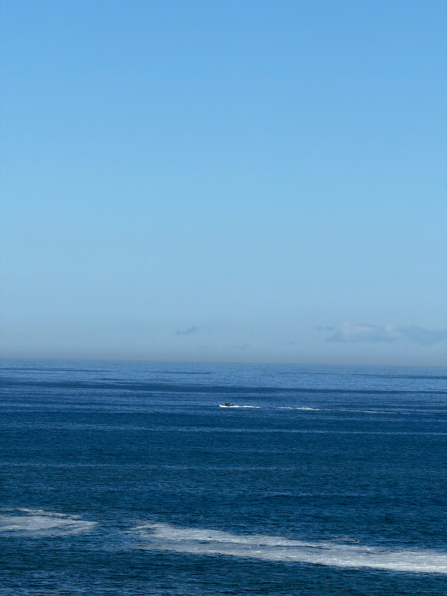 The image shows a seascape with a clear blue sky occupying a significant portion of the left side of the frame. The ocean, a deep blue, fills the right side. Ripples and streaks of white foam indicate…read more