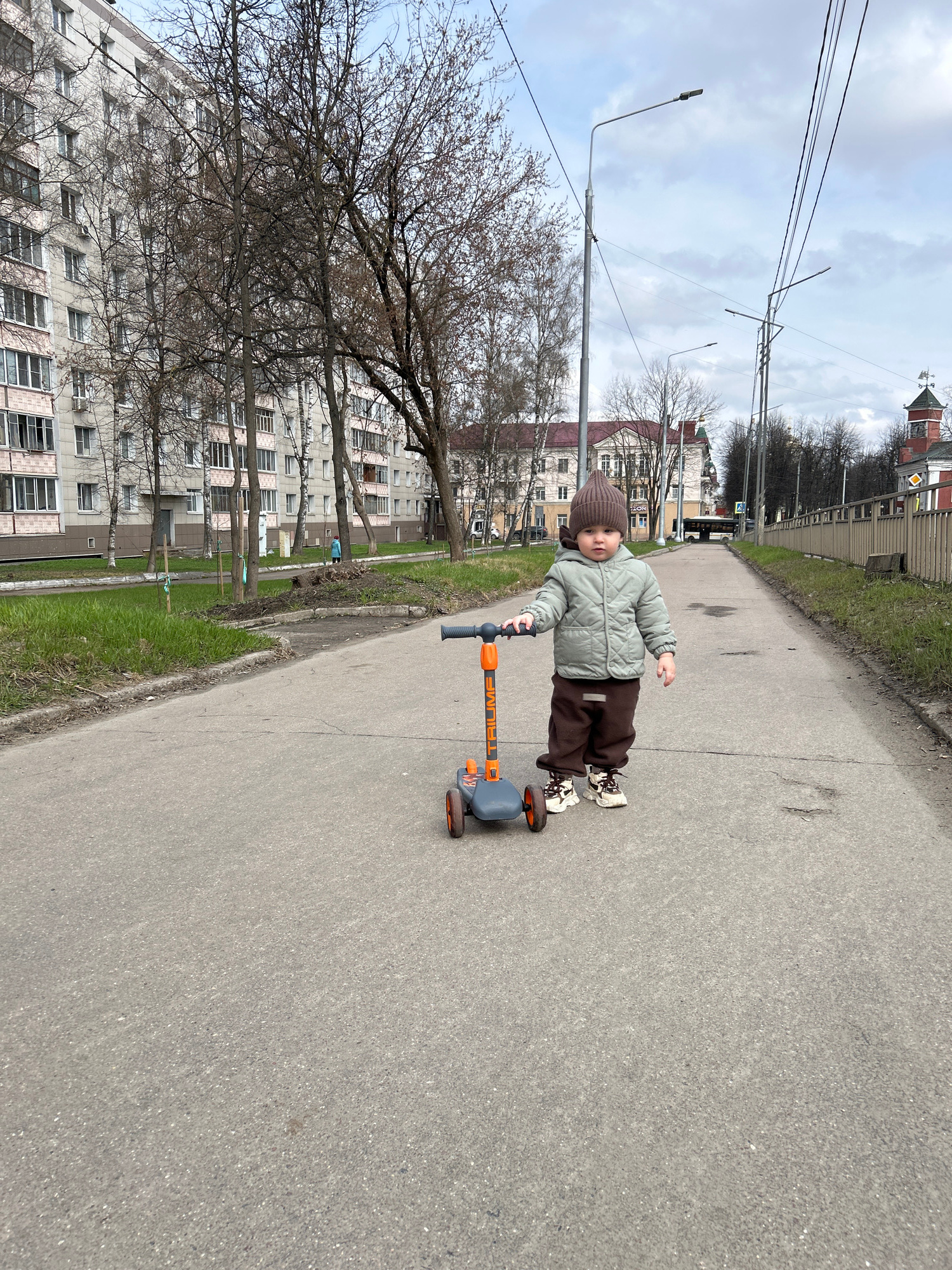A small child, approximately two years old, stands on a gray paved path in Klin, Russia. The child wears a brown knit hat, a light green quilted jacket, and brown pants. The child is riding a three-wh…read more