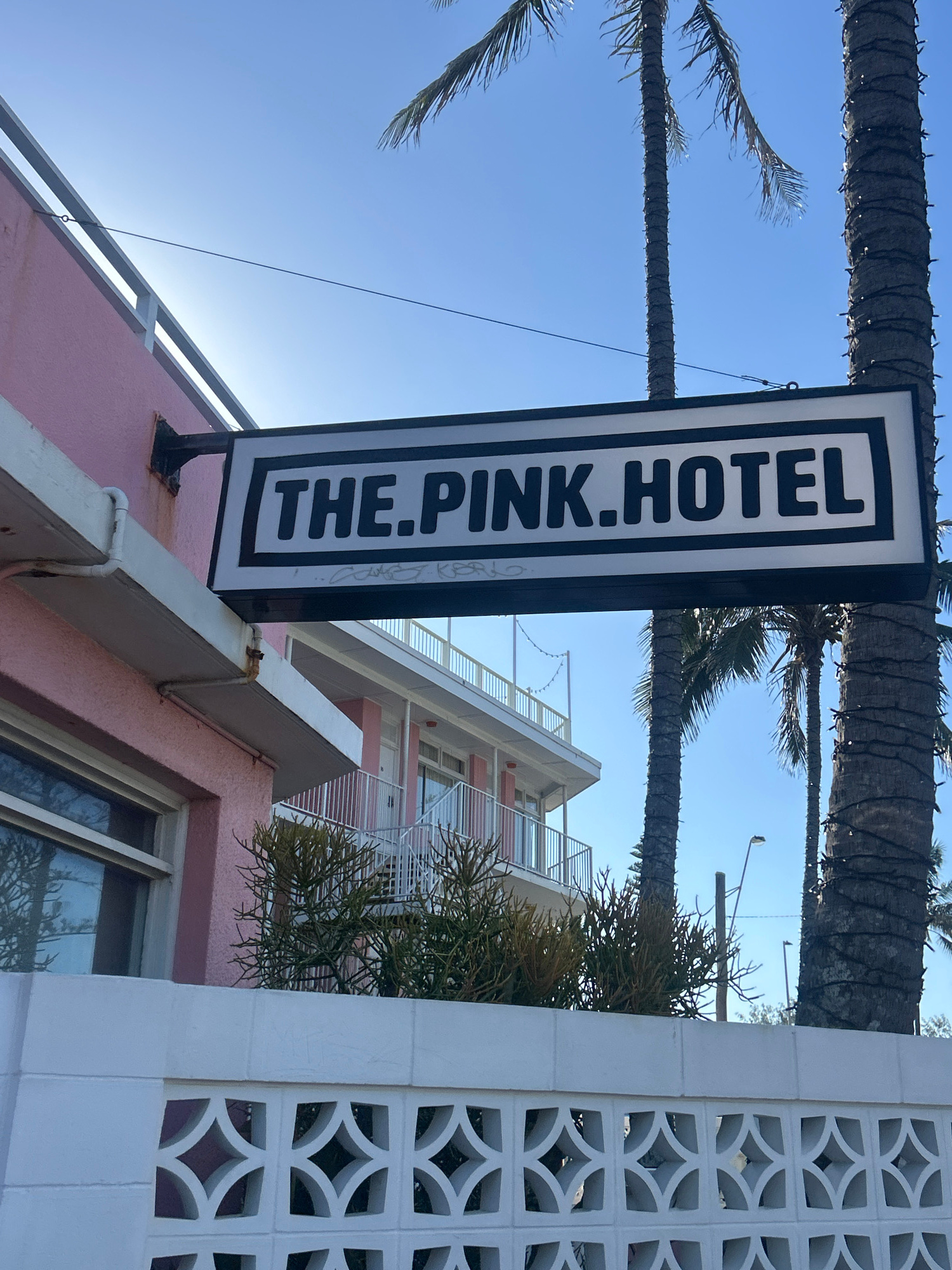 A vertical photograph captures a view of "THE PINK HOTEL" sign attached to a pink-colored building, situated in Gold Coast City, Australia. The sign features bold, black capital letters against a whit…read more