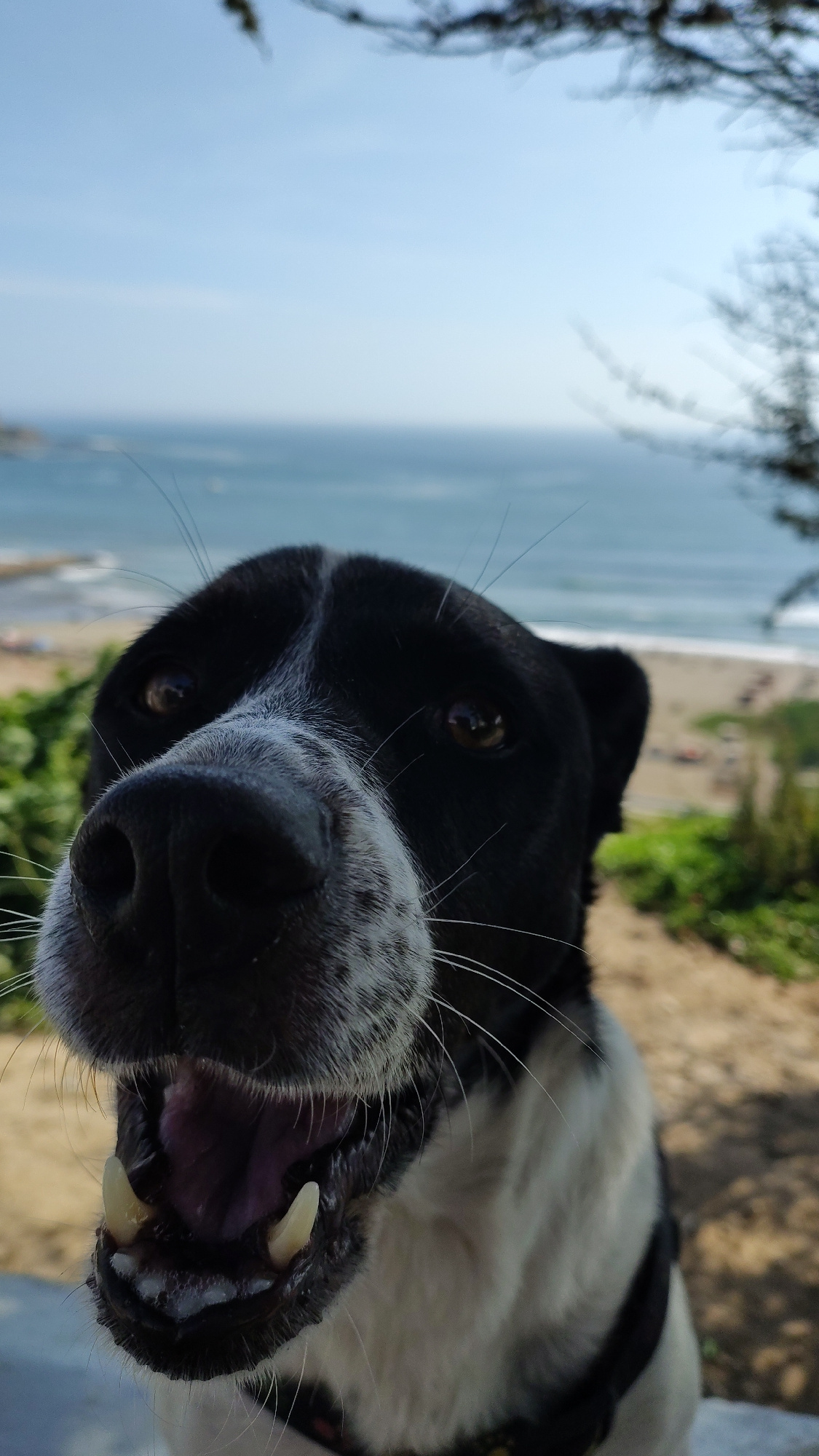 A close-up, canted-angle photograph captures a black and white dog with its mouth slightly open, revealing its teeth. The dog's nose is prominently featured in the foreground. The dog's eyes are visib…read more