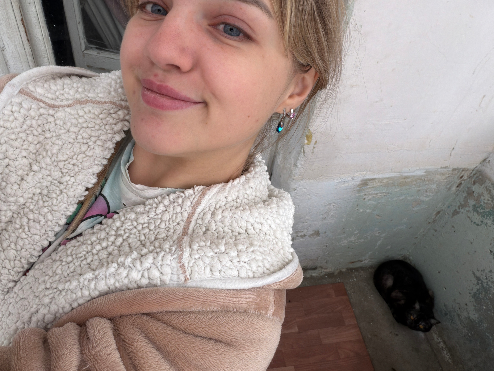 A young woman with blonde hair and blue eyes is featured in a close-up, slightly rotated selfie. She wears a beige, plush-lined jacket. In the background, out of focus, there is a dark cat sitting in…read more