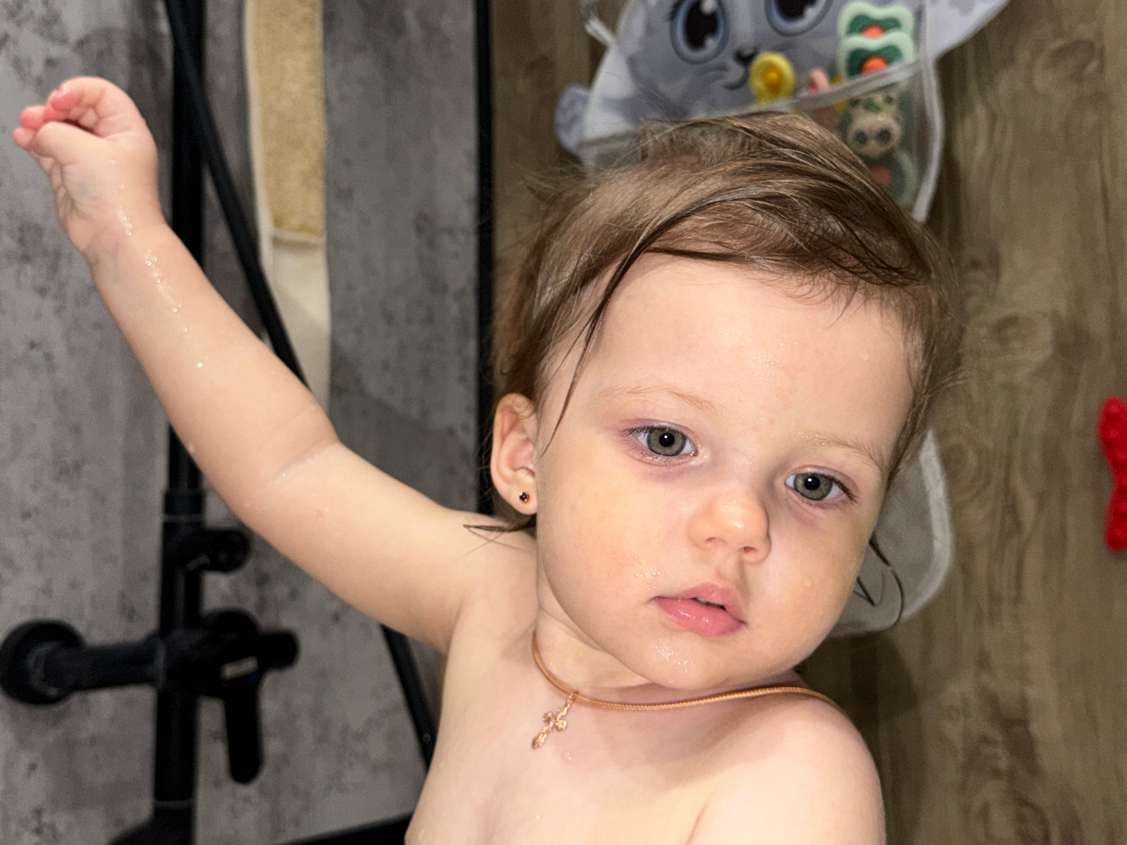 A young child, possibly a toddler, is depicted indoors, likely in a bathroom or shower area. The child, who appears to be fair-skinned with light brown hair and grey eyes, is wearing a small gold neck…read more