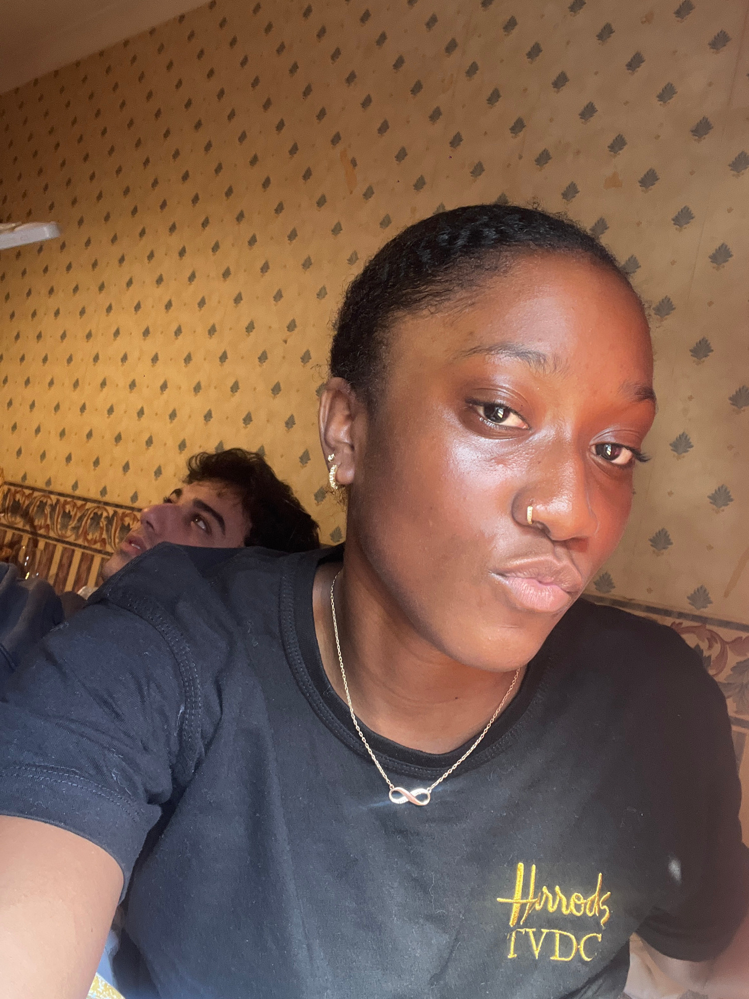 A close-up, slightly rotated selfie of a dark-skinned person with short hair wearing a black T-shirt with "Harrods TVDC" embroidered in gold. The person is also wearing a gold nose ring and a delicate…read more