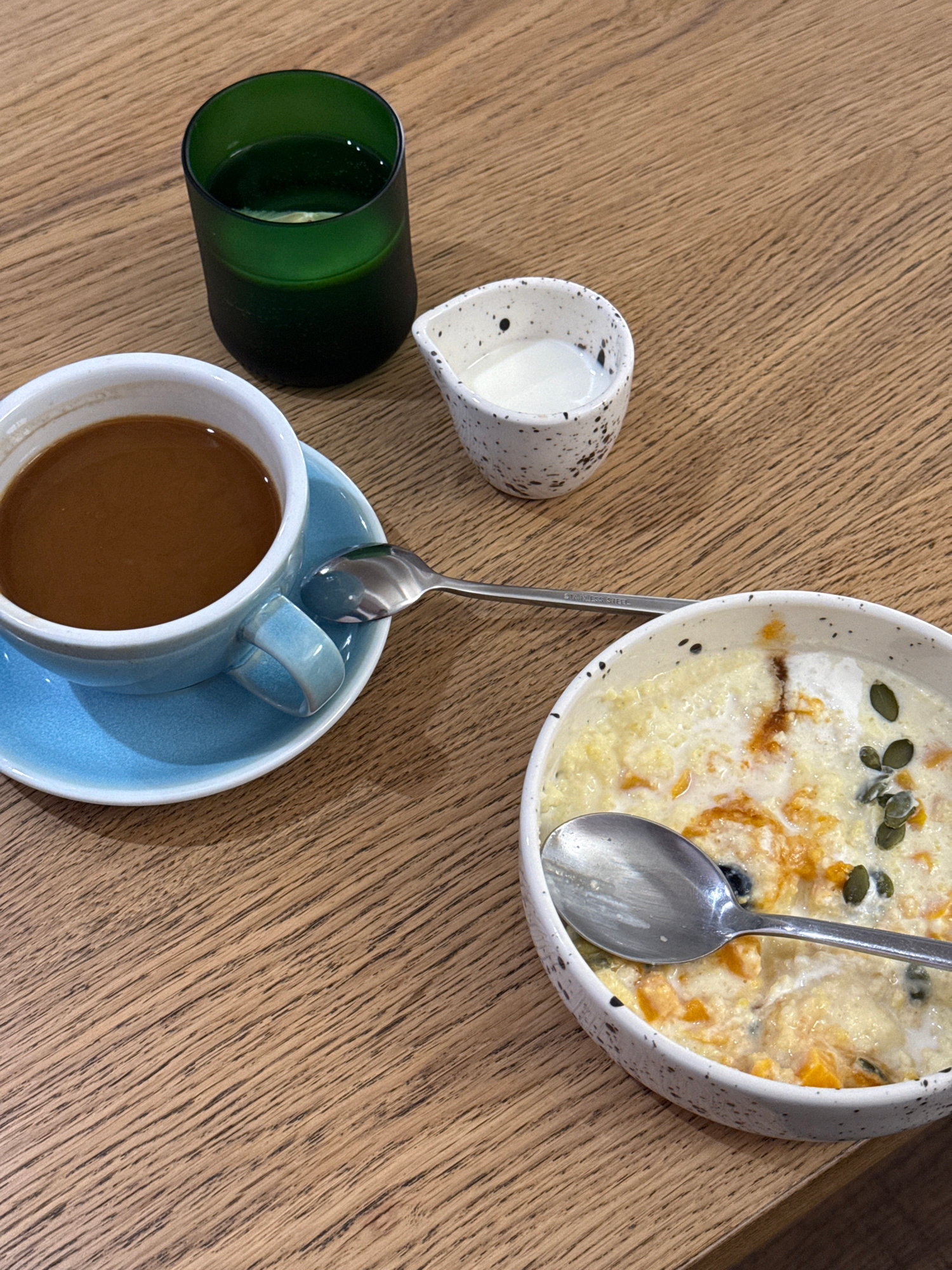 A high-angle shot captures a breakfast setting on a wooden table. The setting includes a blue teacup filled with coffee on a matching saucer, a speckled creamer containing milk, a green glass, and a s…read more
