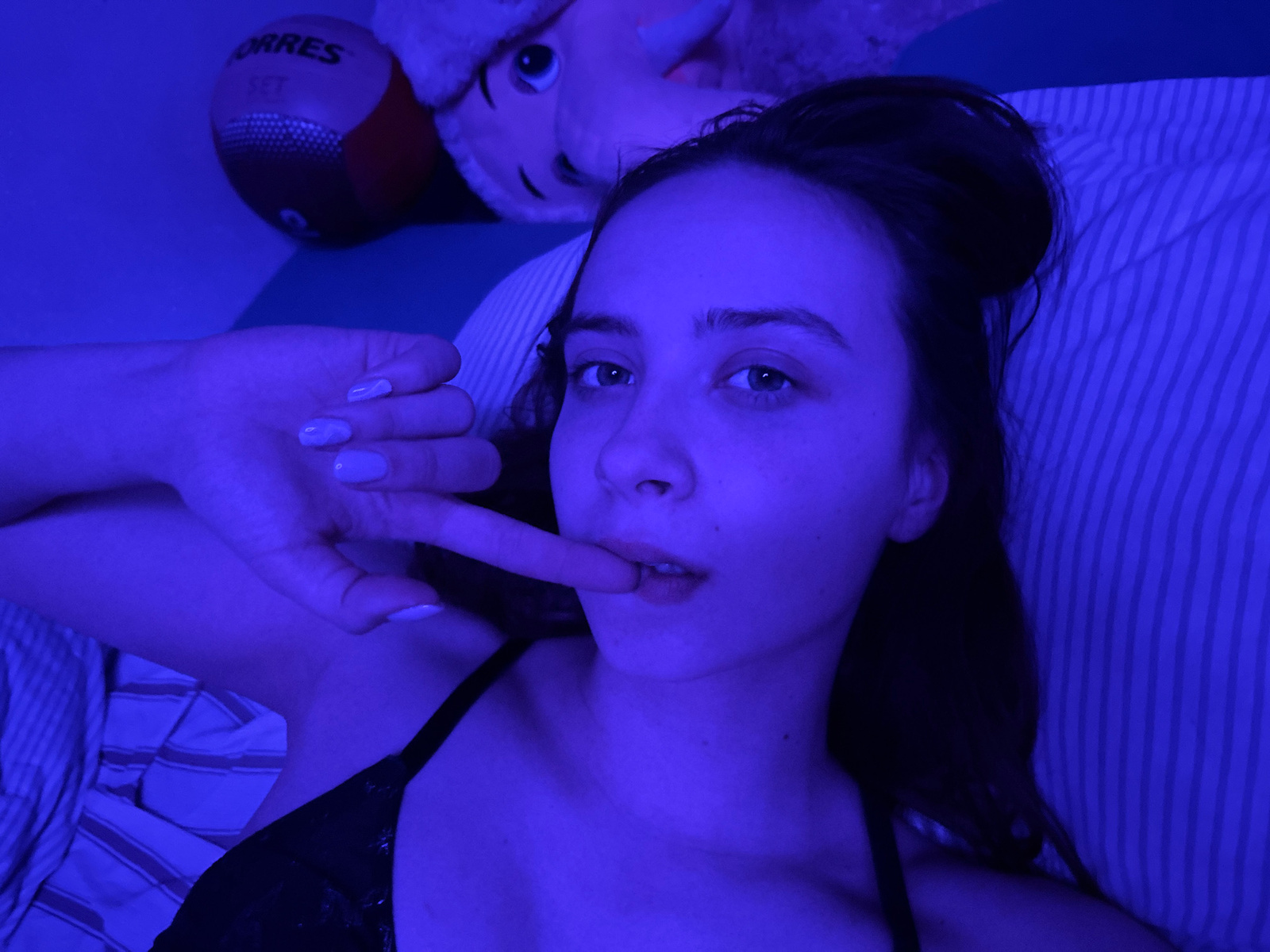 A young woman is captured in a close-up, high-angle shot, lying down indoors, likely on a bed, under pervasive blue ambient lighting. She looks directly into the camera with a neutral to slightly pens…read more