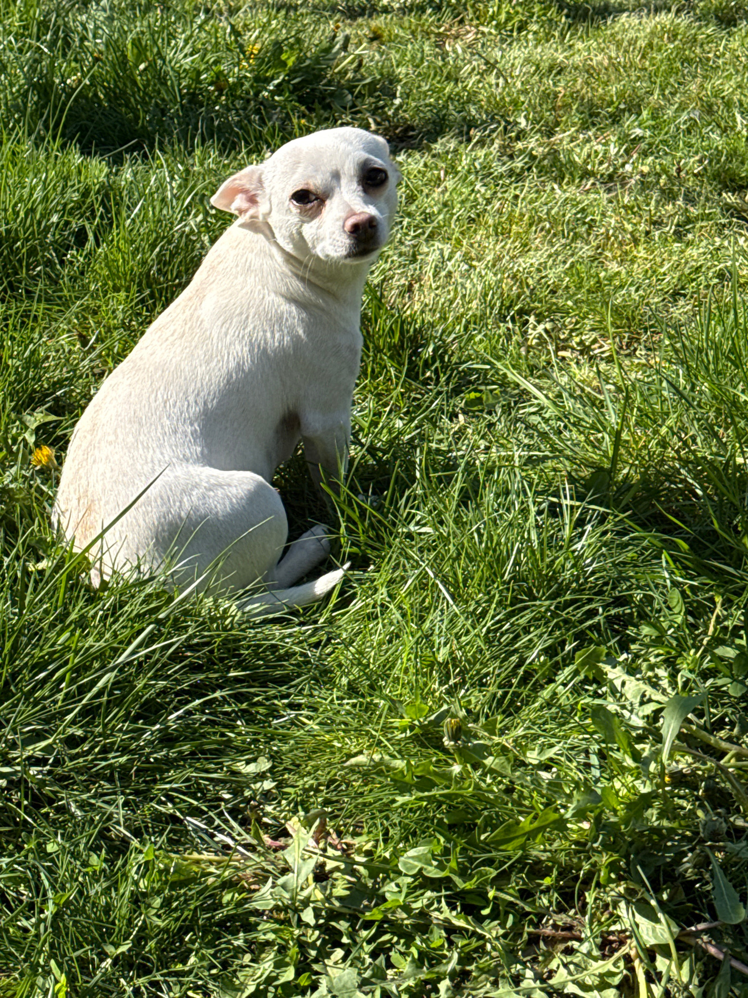 A white dog is lying in green grass. The location is Ravno pole, Bulgaria.