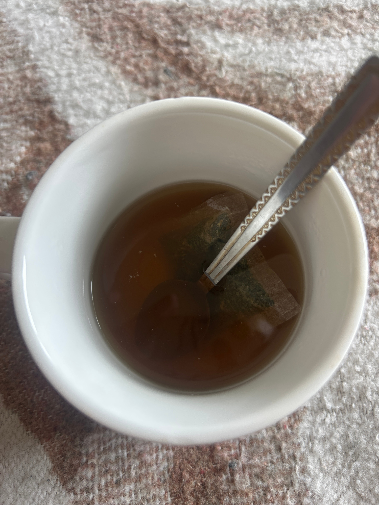 A top-down shot shows a white mug filled with dark brown liquid, presumably tea, with two tea bags steeping inside. A silver spoon rests in the mug. The mug is set on a textured, patterned surface tha…read more