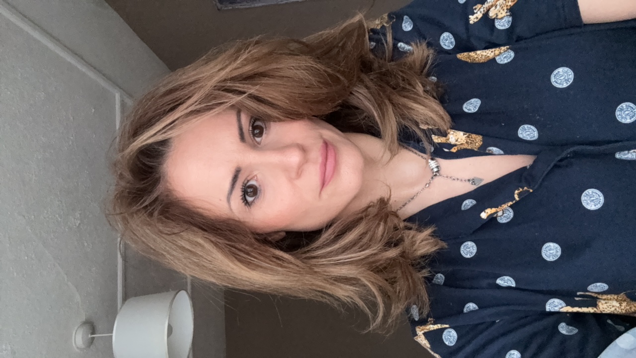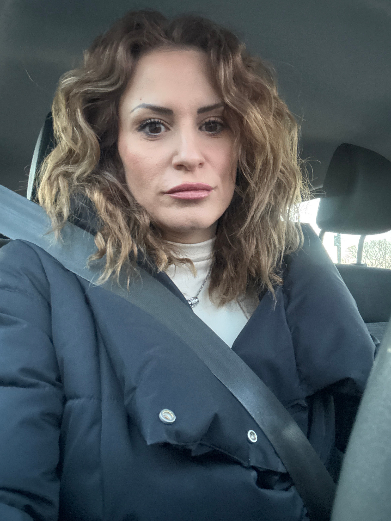 A woman with curly brown hair is wearing a navy blue puffer jacket and a seatbelt in a car. She is looking at the camera. The scene is likely indoors, in a vehicle. The location is unknown and there i…read more