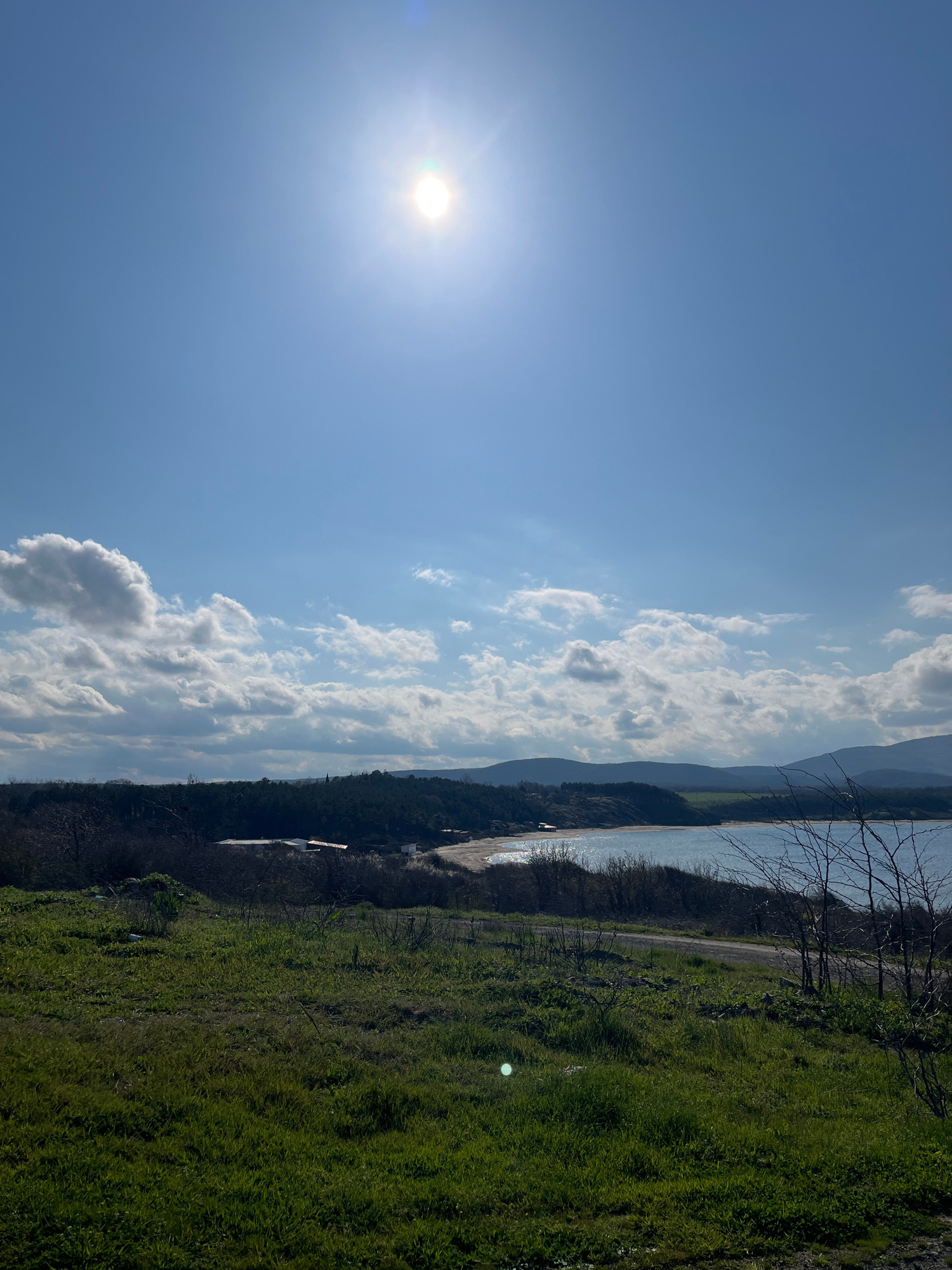 The image depicts a landscape in Ahtopol, Bulgaria. The view is from a grassy area, overlooking a coastline with a beach and water. Beyond the water, there's a line of hills or mountains visible in th…read more