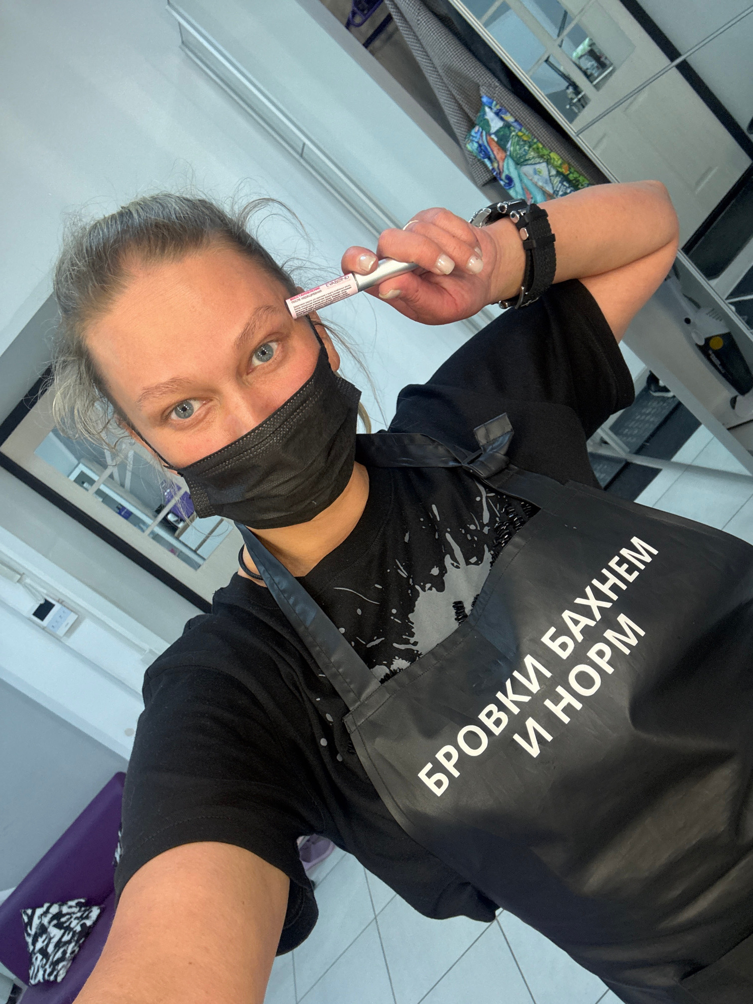 A woman wearing a black t-shirt, black apron with white Cyrillic text, and a black face mask, holds a tube of eyebrow makeup to her forehead. She has blue eyes and gray hair. She wears a black watch o…read more