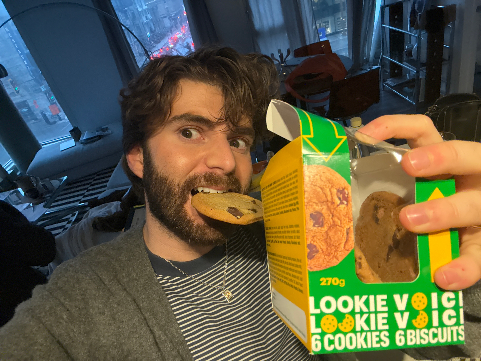 A person is shown in a selfie holding a box of "Lookie V Voici" cookies in front of their face and eating a cookie from the box. The cookie box is green and yellow and contains 6 cookies. The person h…read more