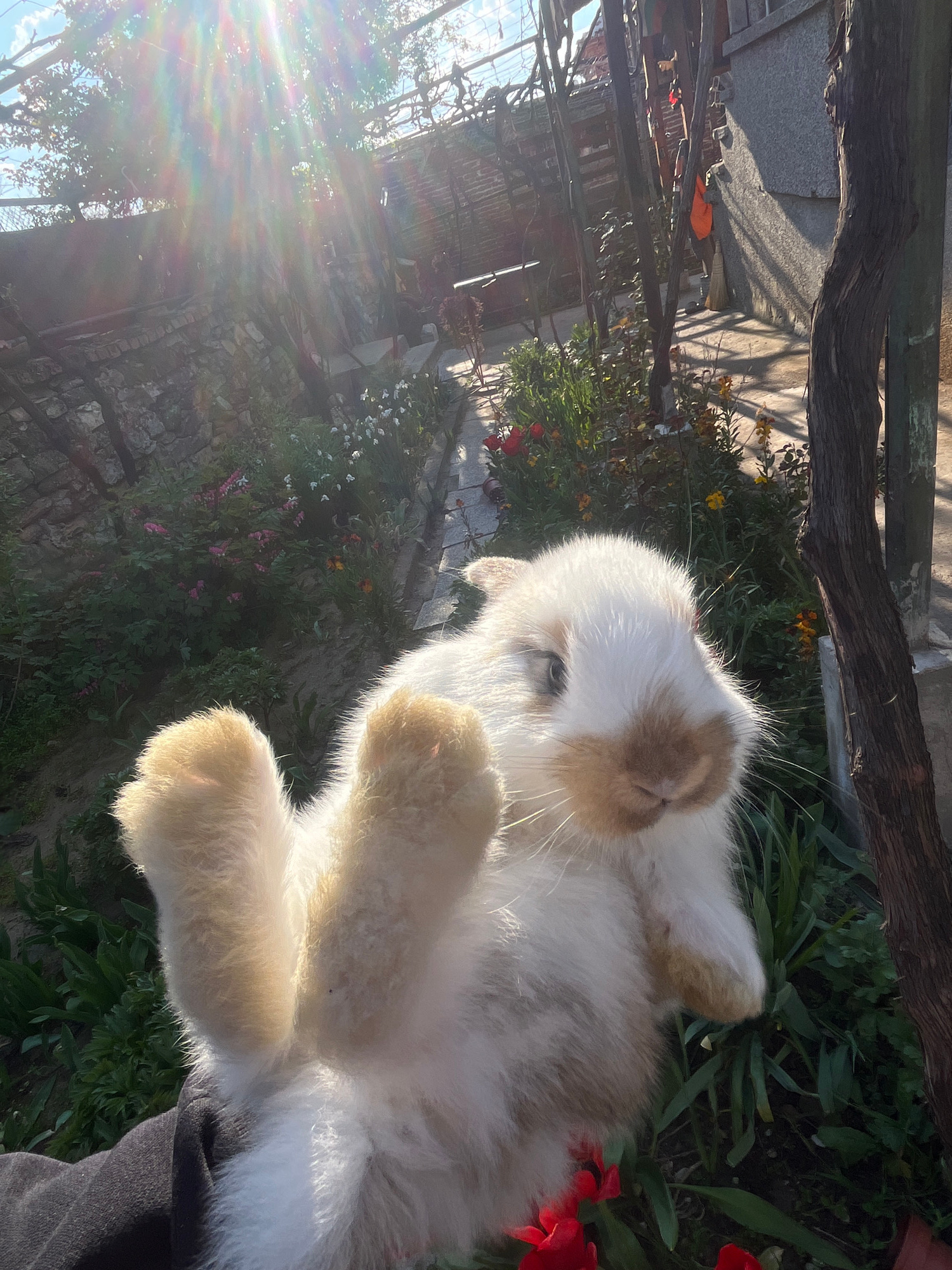 A fluffy rabbit with predominantly white fur and light brown markings on its face, ears, and paws is the central subject of the image. The rabbit appears to be held by a person, whose dark-colored clo…read more