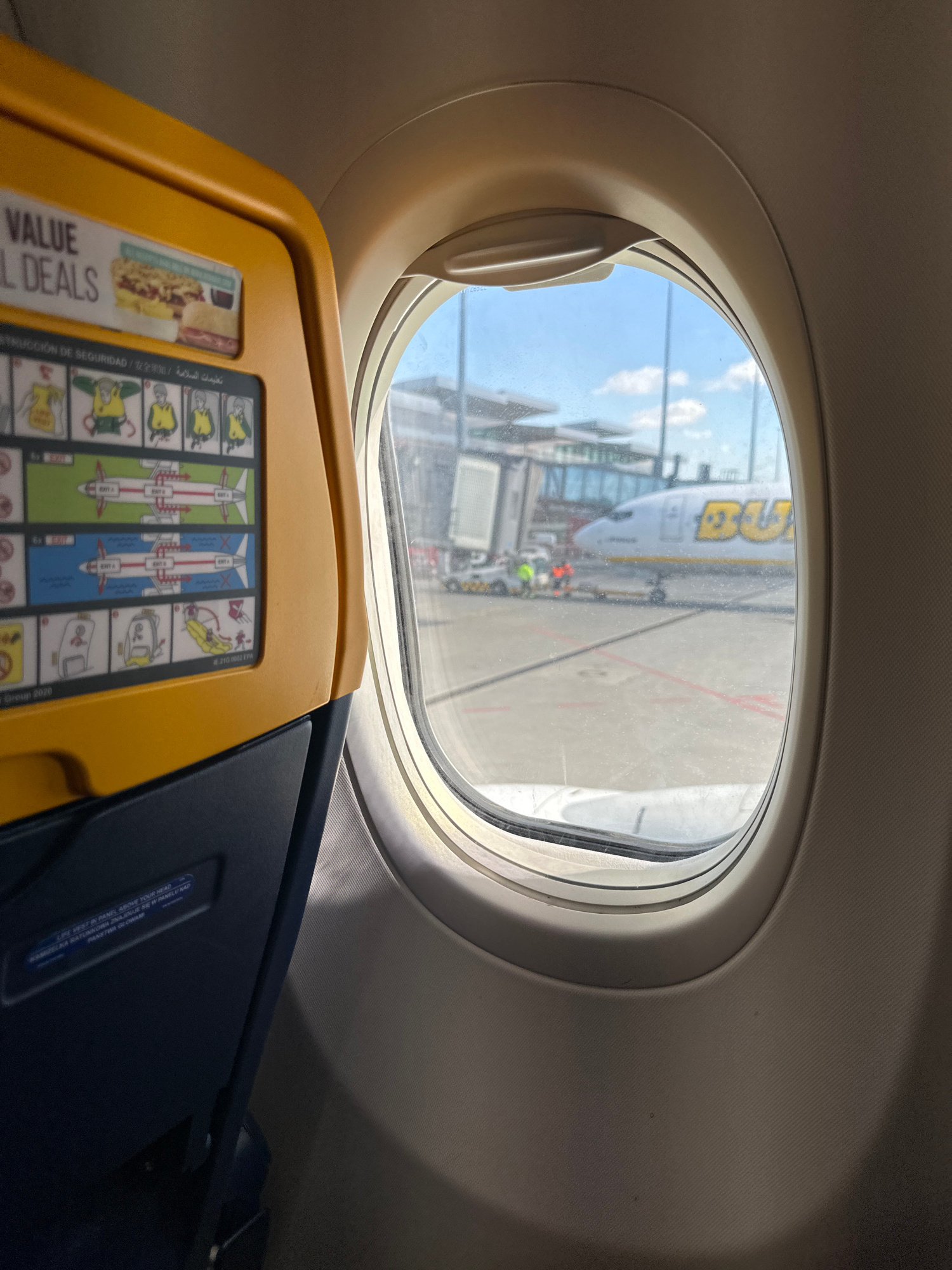 The image, taken from inside an airplane cabin, shows a view through a window of a Boeing 737-800, likely operated by Ryanair. The aircraft is parked at a terminal. Visible through the window is a sec…read more