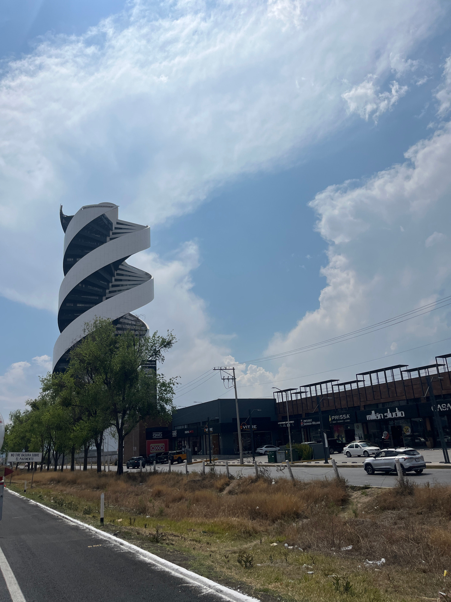 The image depicts a view of a distinctive architectural structure in San Bernardino Tlaxcalancingo, Mexico. The building is characterized by its spiraling, white and black design, rising against a bac…read more