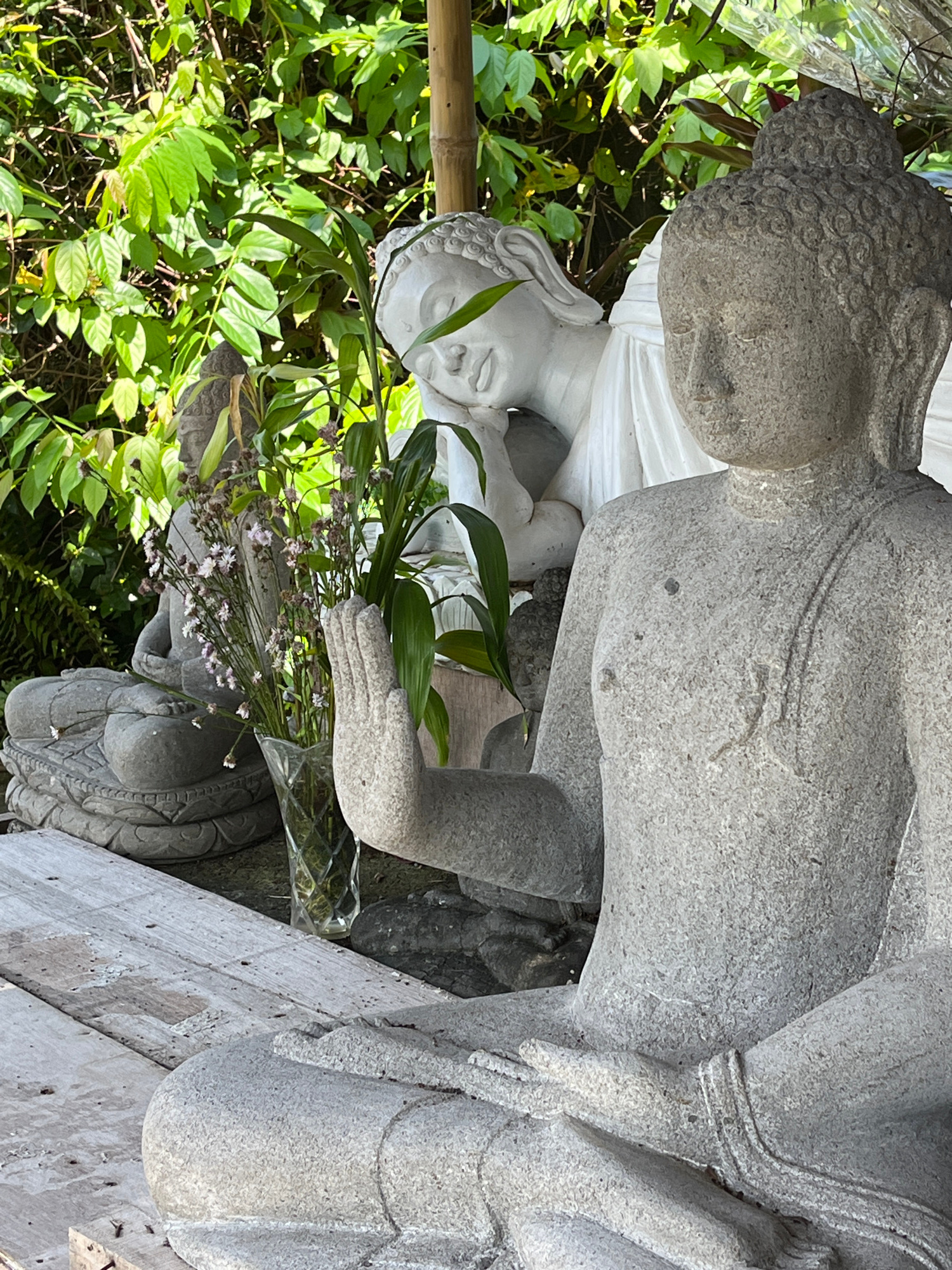 The image features a statue of a figure, likely a Buddha, made of gray stone with visible textures and patterns. The statue is positioned near a lush green area with plants and foliage, suggesting it…read more
