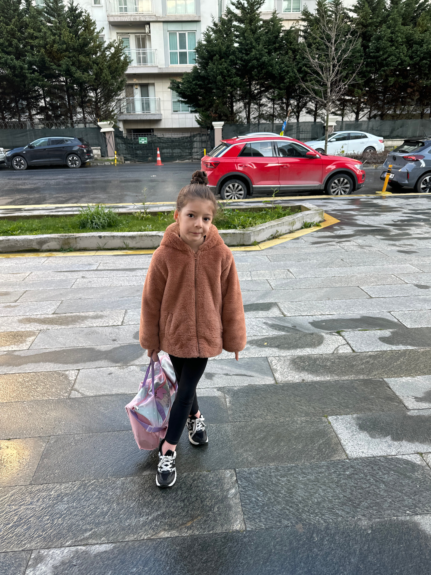 A young girl stands on a sidewalk in Esenyurt, Turkey. She wears a brown, fuzzy jacket, black leggings, and black-and-white sneakers. She carries a pink and purple bag in her right hand. The sidewalkโฆread more