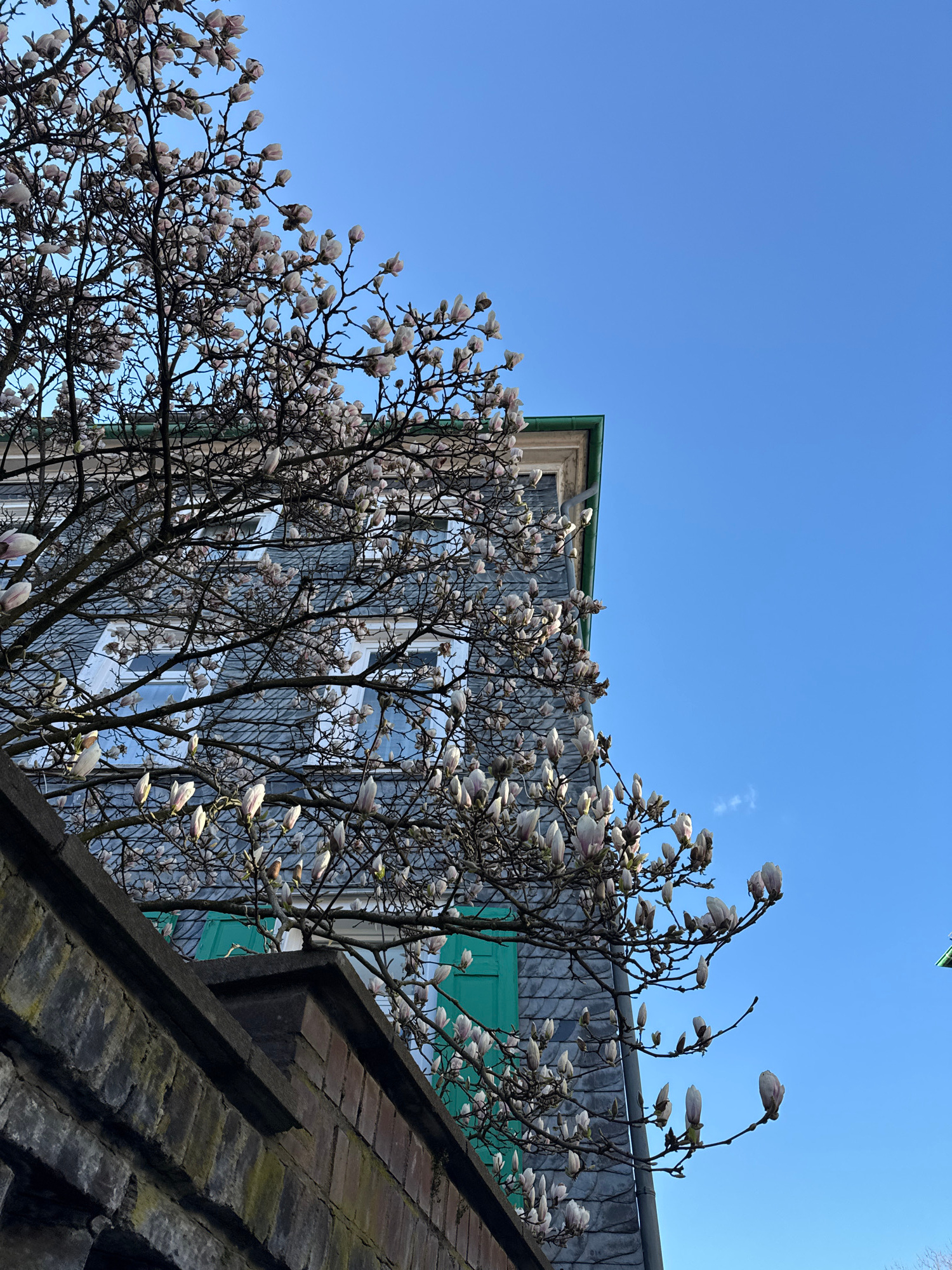 The image shows a magnolia tree in bloom against a blue sky, positioned in front of a multi-story building in Remscheid, Germany. The building features a facade with a gray, tiled appearance and rows…read more