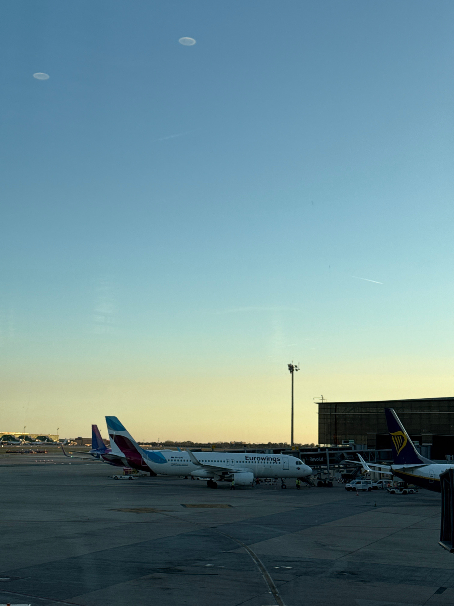 The image depicts an airport scene at El Prat de Llobregat, Spain. Several commercial airplanes are parked at the terminal, including a Eurowings aircraft and a Ryanair plane. A tall light pole standsβ¦read more