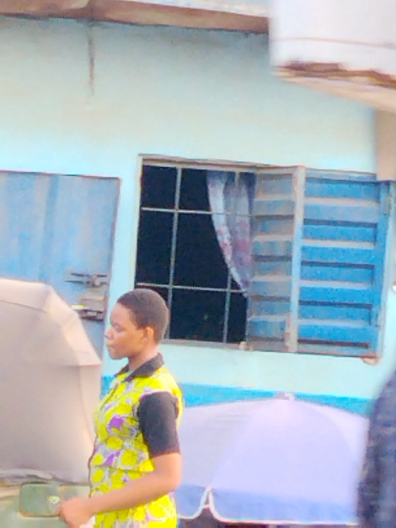 The image shows a woman in a yellow and black patterned dress in front of a light blue building with a barred window and a blue metal door. A partially obscured white and blue umbrella is also visible…read more