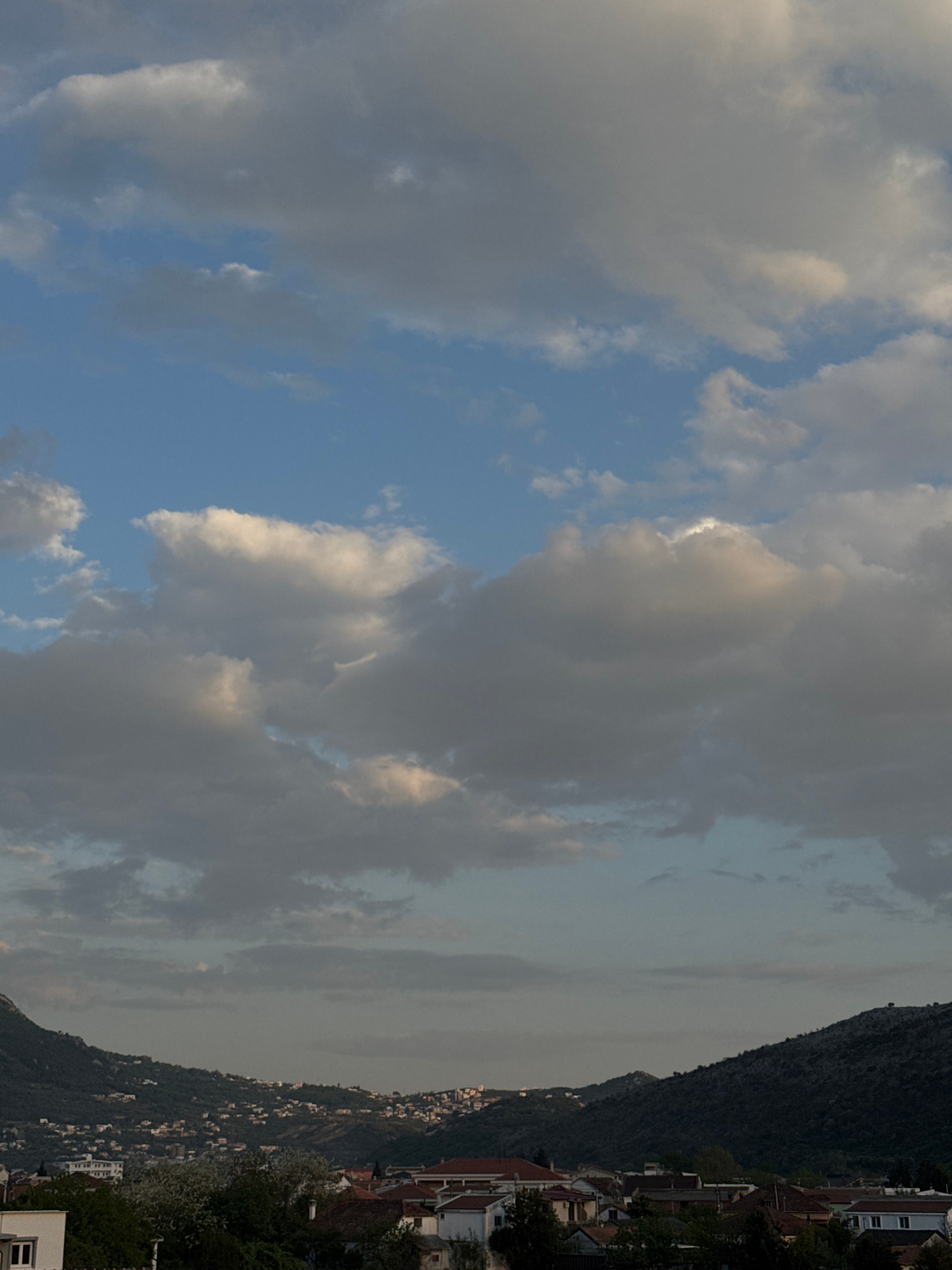 View of Polje, Montenegro, at dusk. The landscape features a mountain covered in dense trees and scattered buildings. The sky is filled with clouds, transitioning from light blue to darker gray. Build…read more