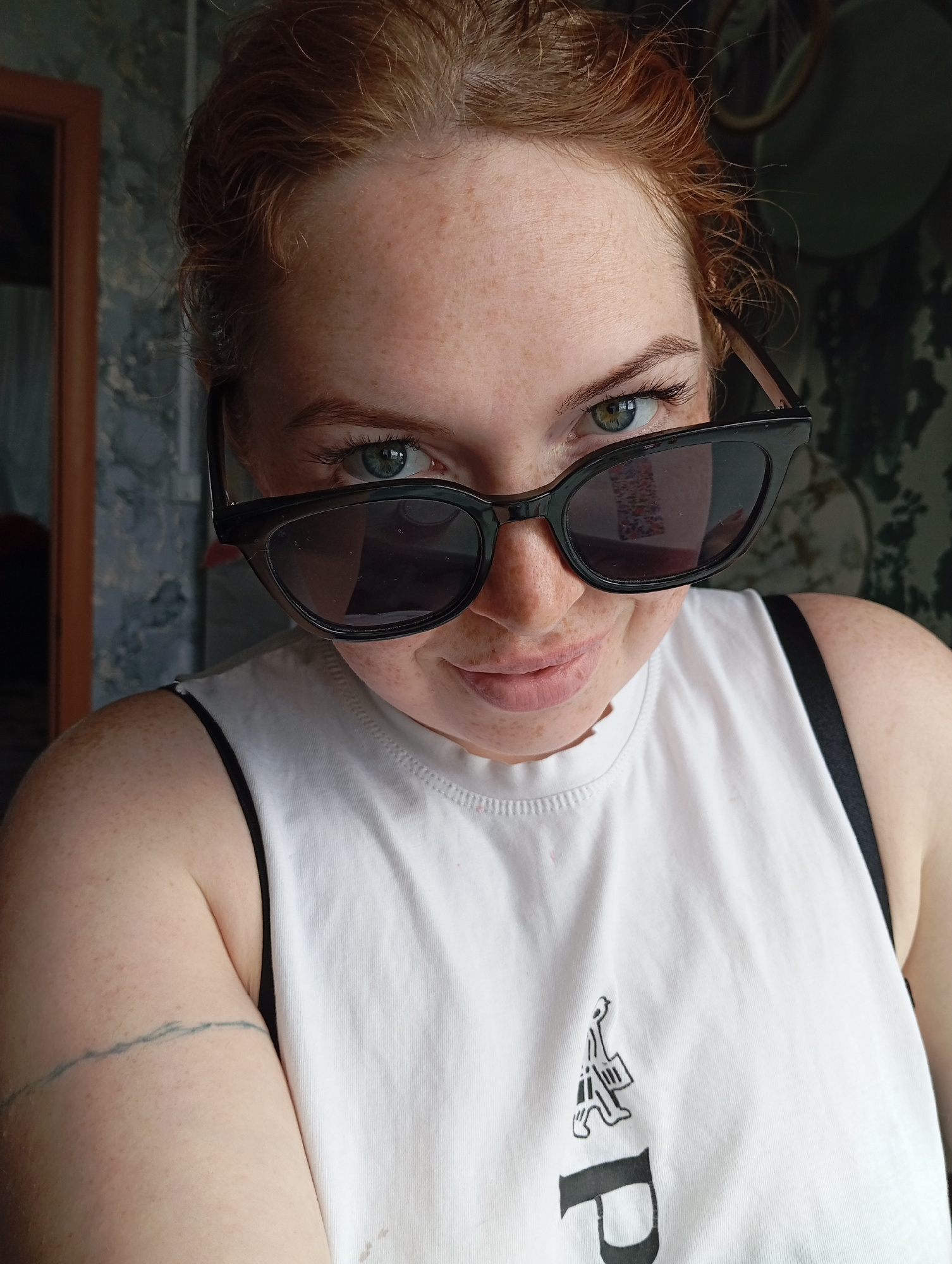A fair-skinned person with red hair and freckles is wearing black sunglasses and a white t-shirt with black lettering. They are looking directly at the camera from a low angle. The background appears…read more