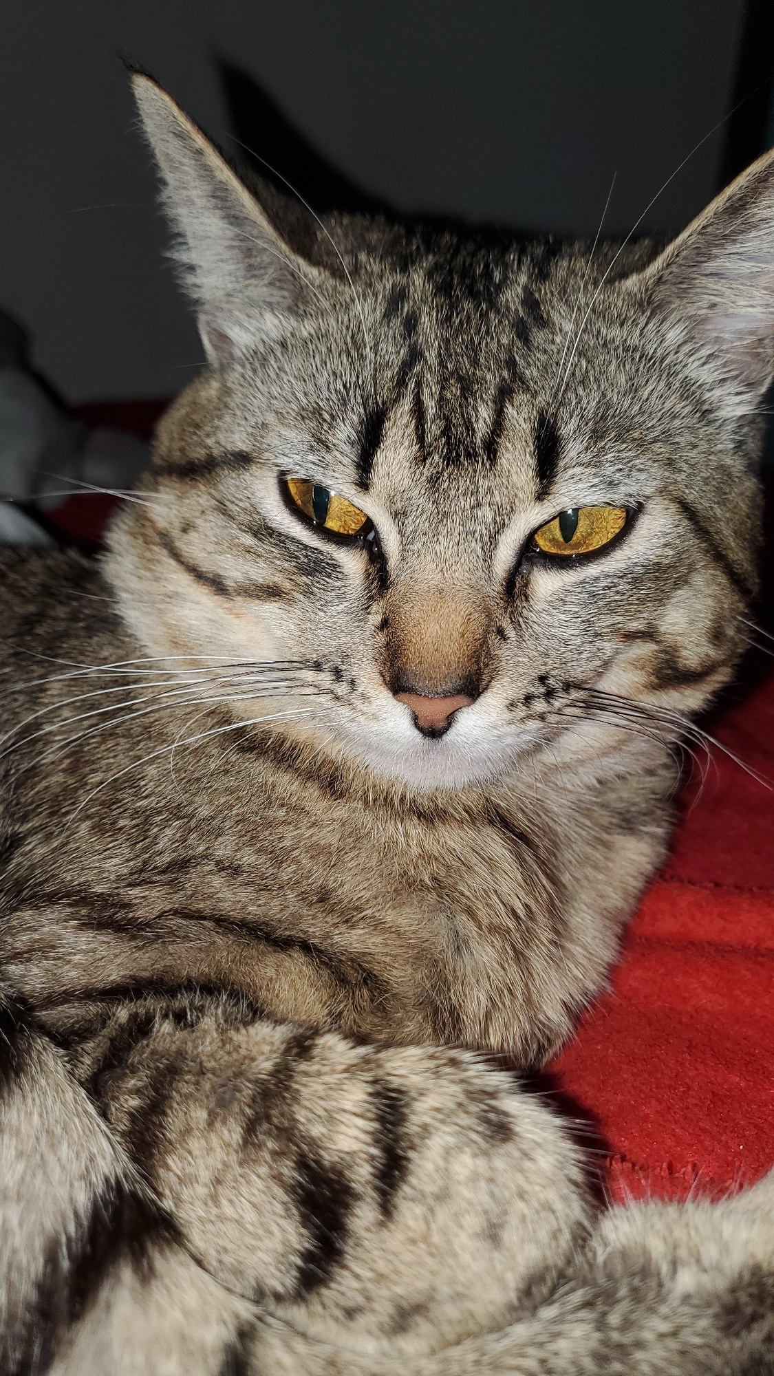 A close-up photograph shows a tabby cat with yellow eyes and a pink nose. The cat's fur is a mix of gray, brown, and black stripes. The cat is resting, its head tilted slightly. A red fabric is visibl…read more