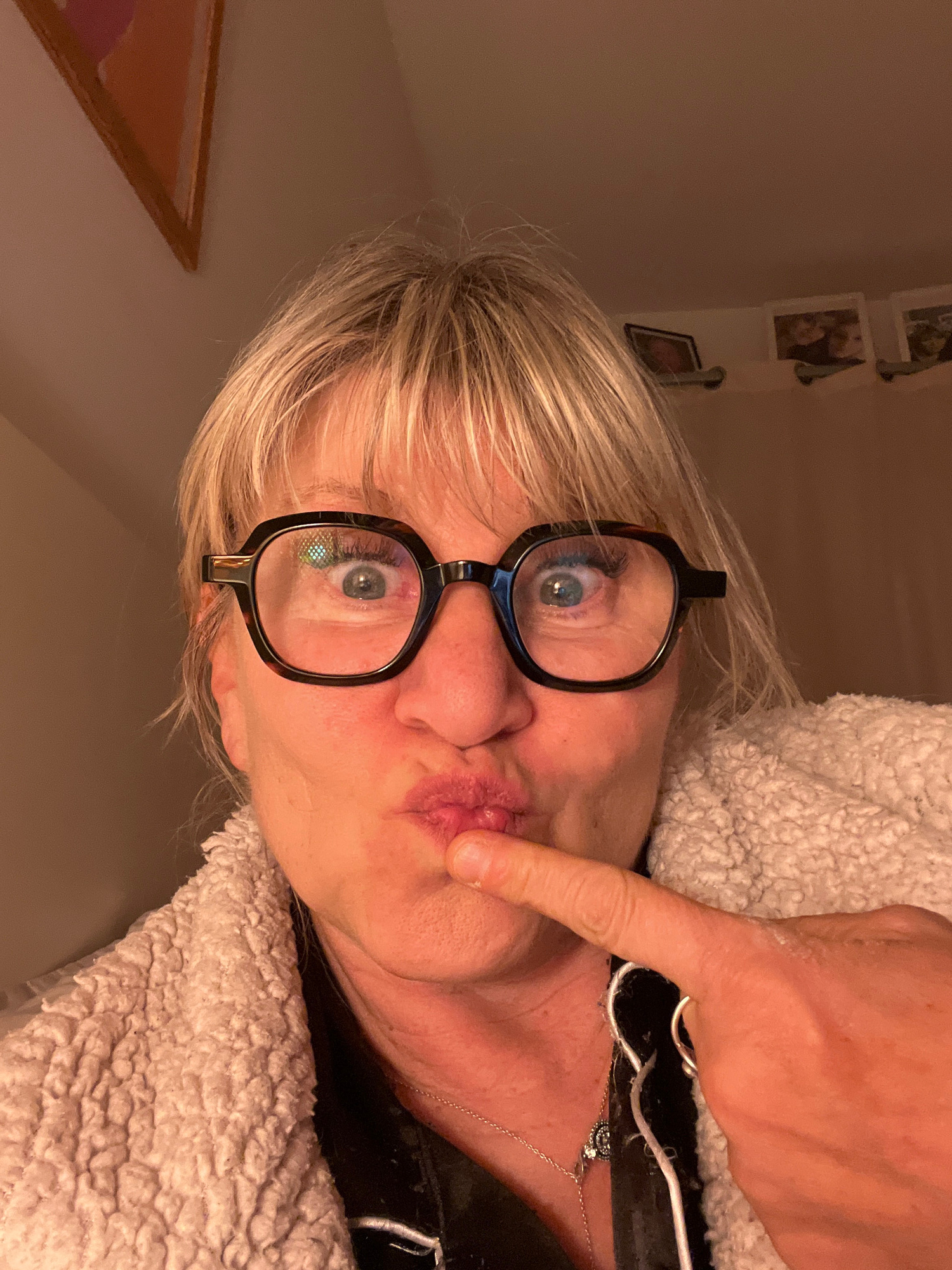 A woman is shown in a close-up shot, wearing black-rimmed glasses, with blonde hair. She is pursing her lips and touching them with her index finger. She is wearing a white, fuzzy sweater. A black top with a white trim is visible underneath the sweater. A thin, silver necklace is around her neck. The background shows a beige wall with framed pictures hanging. The bottom left corner shows a corner of a picture frame. The image was not taken in Chambœuf, France. | Open Wire
