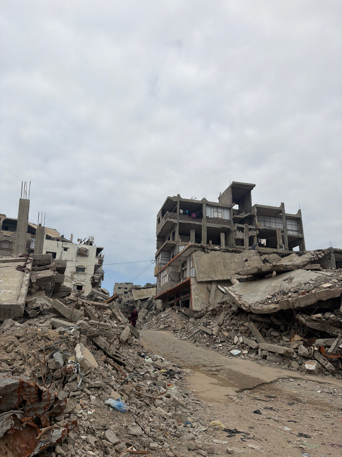 Rubble and collapsed buildings dominate the scene under a cloudy sky. Concrete debris is scattered across the foreground and background, indicating widespread destruction. The skeletal remains of stru…read more