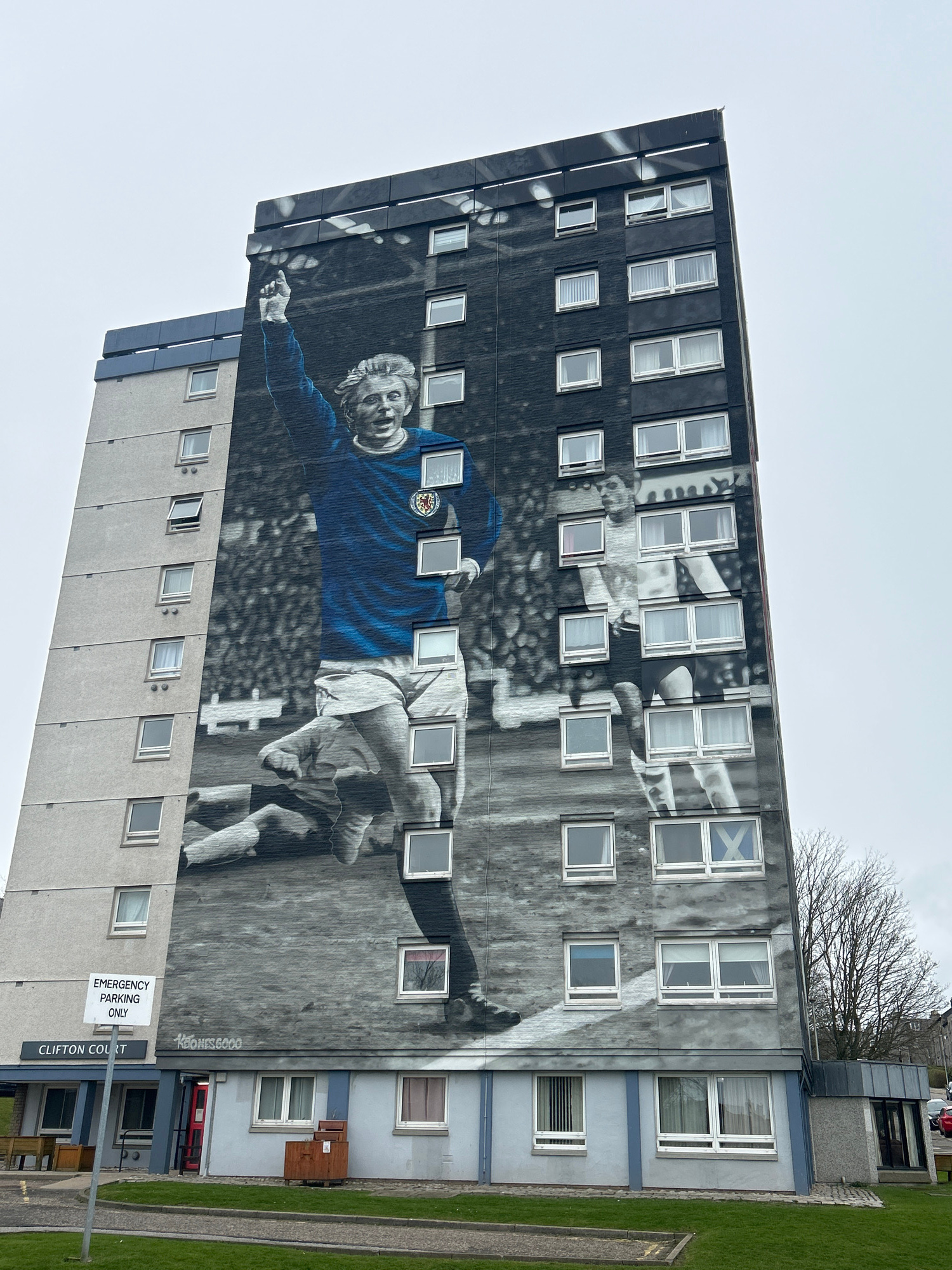 The image shows a high-rise building in Aberdeen City, United Kingdom, featuring a mural of a football player on its exterior. The mural depicts the player in a blue jersey with a team emblem, seeming…read more