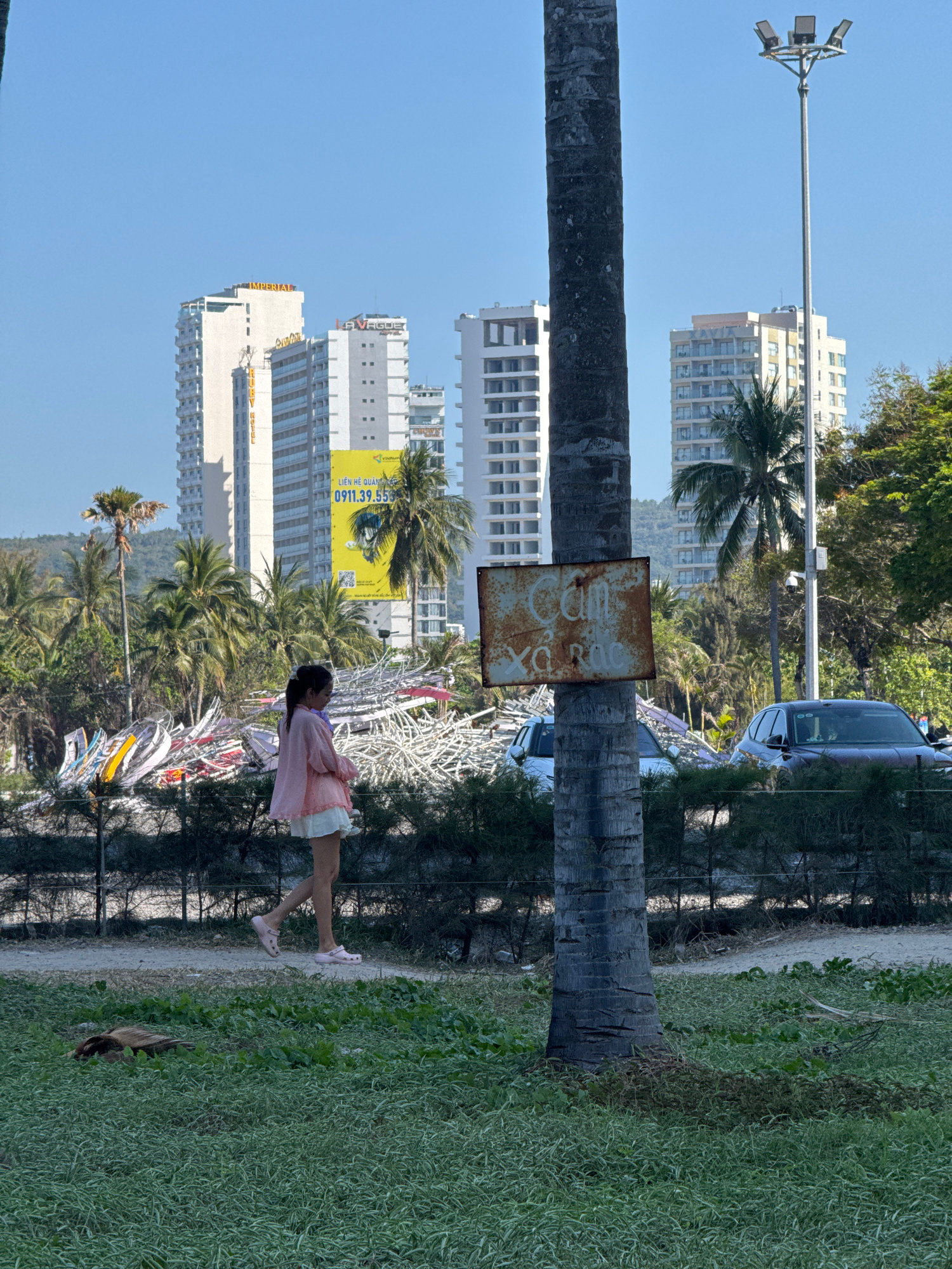 The image depicts a daytime scene in Nha Trang, Vietnam, specifically an area near the beachfront characterized by urban development and green spaces. In the foreground, a large, dark-barked palm tree…read more