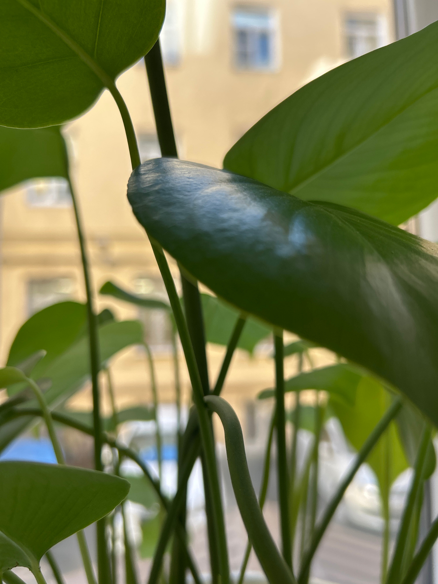 An upward-angled close-up photograph captures the lush green foliage of a houseplant, likely a Monstera, with a blurred urban building visible in the background through a window. The foreground is dom…read more
