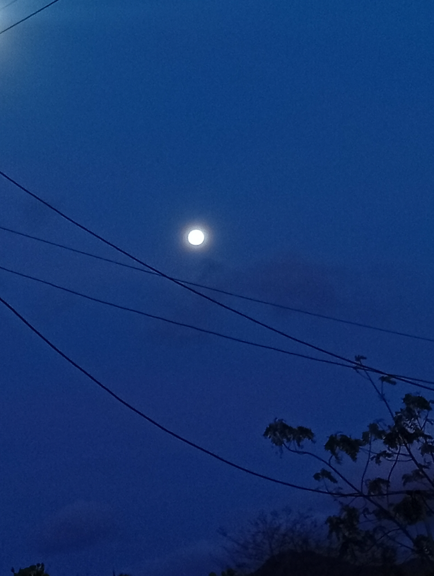 A photograph taken at dusk in Altagracia, Venezuela captures a view of the moon in a dark blue sky. Overhead power lines stretch across the upper and central areas of the frame. Tree branches are visi…read more