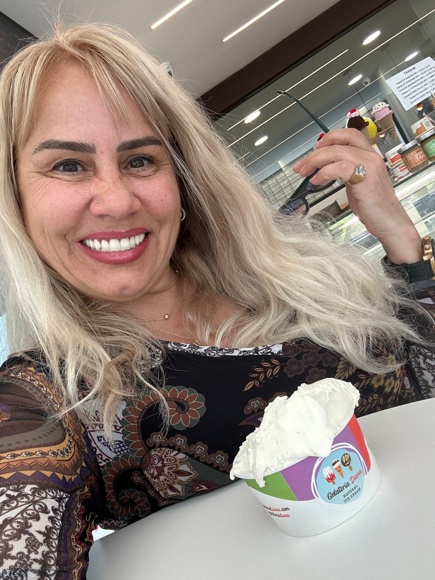 A smiling woman with long, flowing blonde hair takes a selfie indoors. She is positioned slightly off-center, looking directly at the camera with a wide, joyful smile that reveals her teeth. Her dark…read more