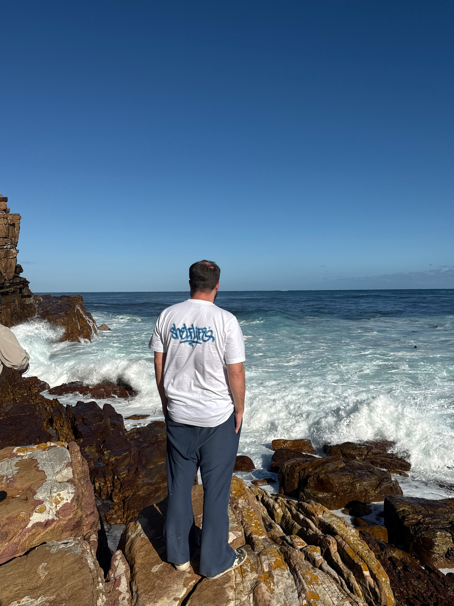 A man is captured from behind, standing on a rugged, rocky coastline and gazing out at the vast ocean under a clear blue sky. The image appears to be taken on a bright, sunny day, likely in Cape Town,…read more