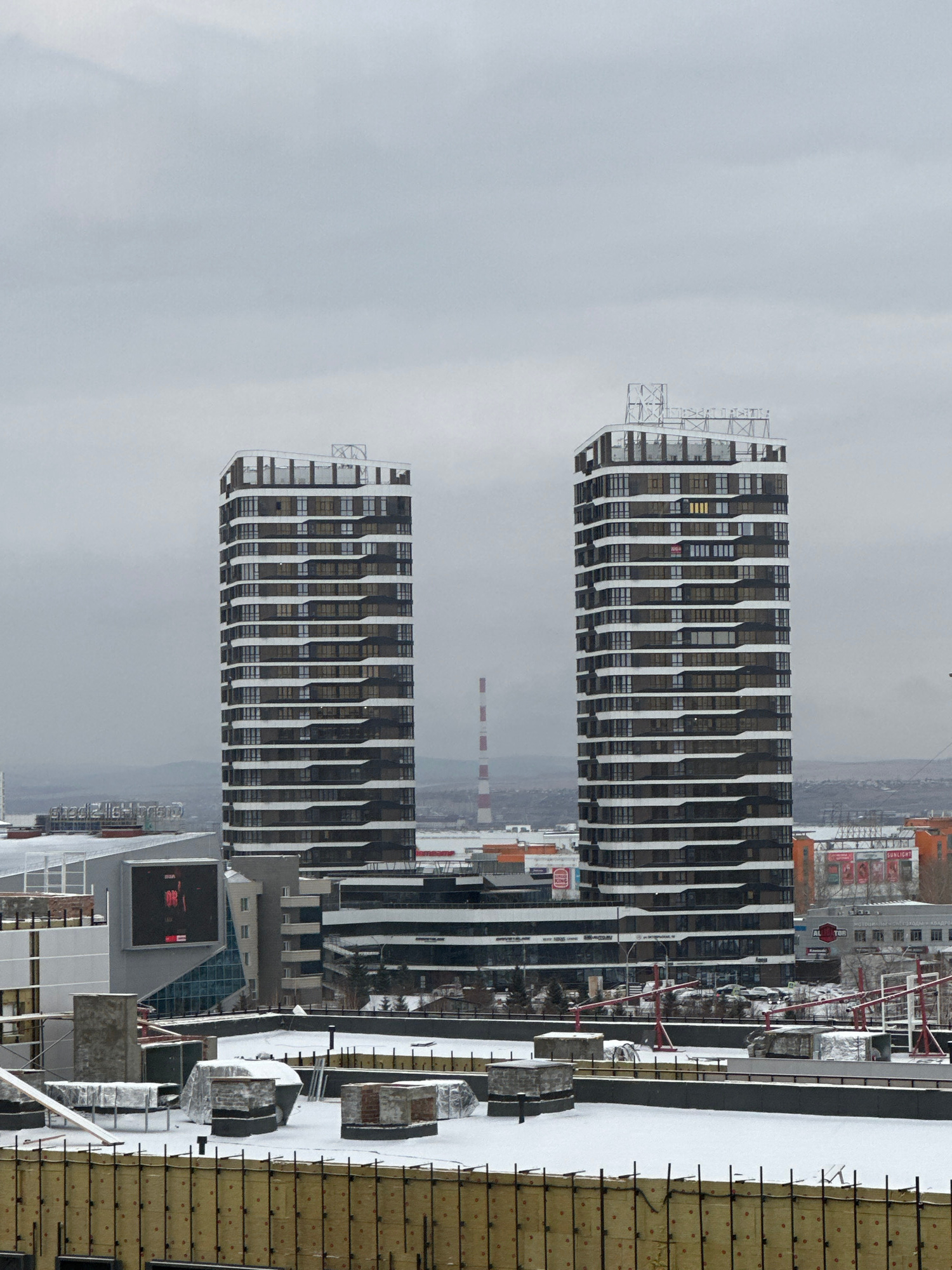 The image presents a view in Krasnoyarsk, Russia, likely from a high vantage point. The primary subjects are two identical high-rise buildings with a distinct modern architectural style, characterized…read more