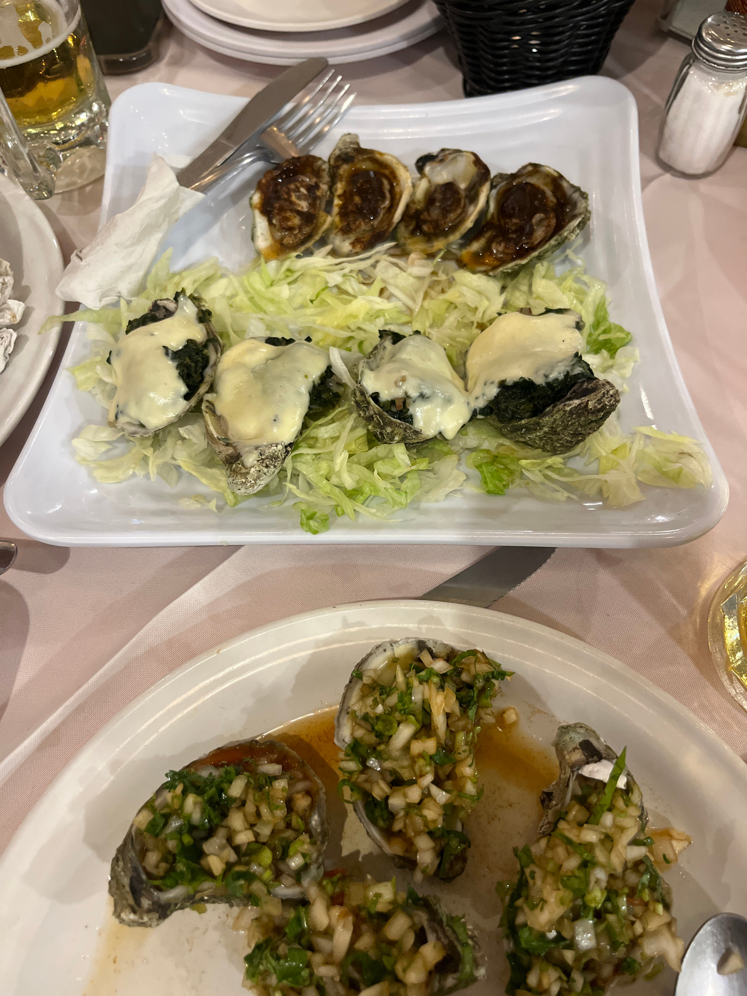 The image shows two plates of oysters, likely taken in a restaurant. One plate contains six oysters, three topped with a white sauce, and three that appear to be baked. They are arranged on a bed of s…read more