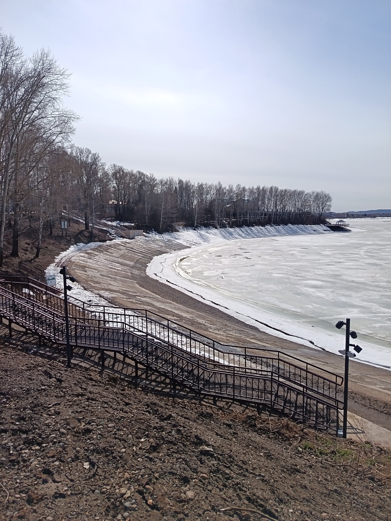 The image depicts a winter scene in Osa, Russia. A large, partially frozen body of water dominates the background, with a shoreline covered in snow and ice. A line of bare trees runs along the edge of…read more