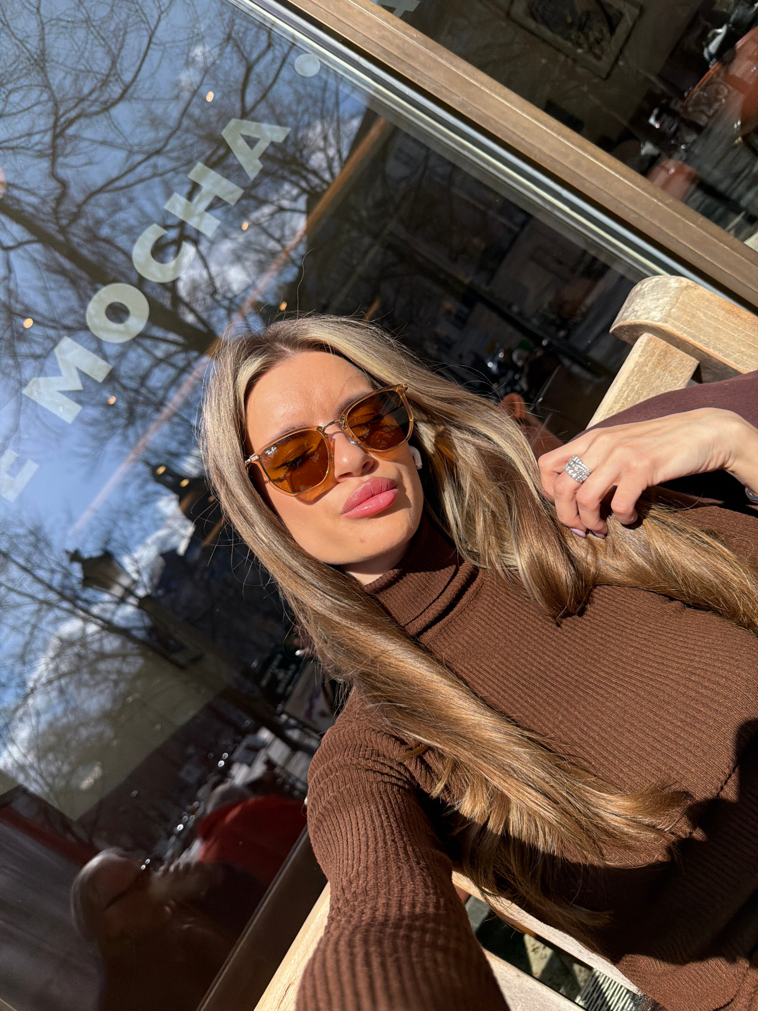 A woman with blonde hair and sunglasses is positioned near a window displaying the reflection of trees and the word "MOCHA." She is wearing a brown ribbed turtleneck sweater and a ring on her left han…read more
