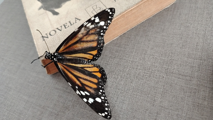 An adult Monarch butterfly (Danaus plexippus) is shown resting with its wings open on a light-colored book in Chorrillos, Peru. The butterfly displays characteristic orange and black wing patterns wit…read more