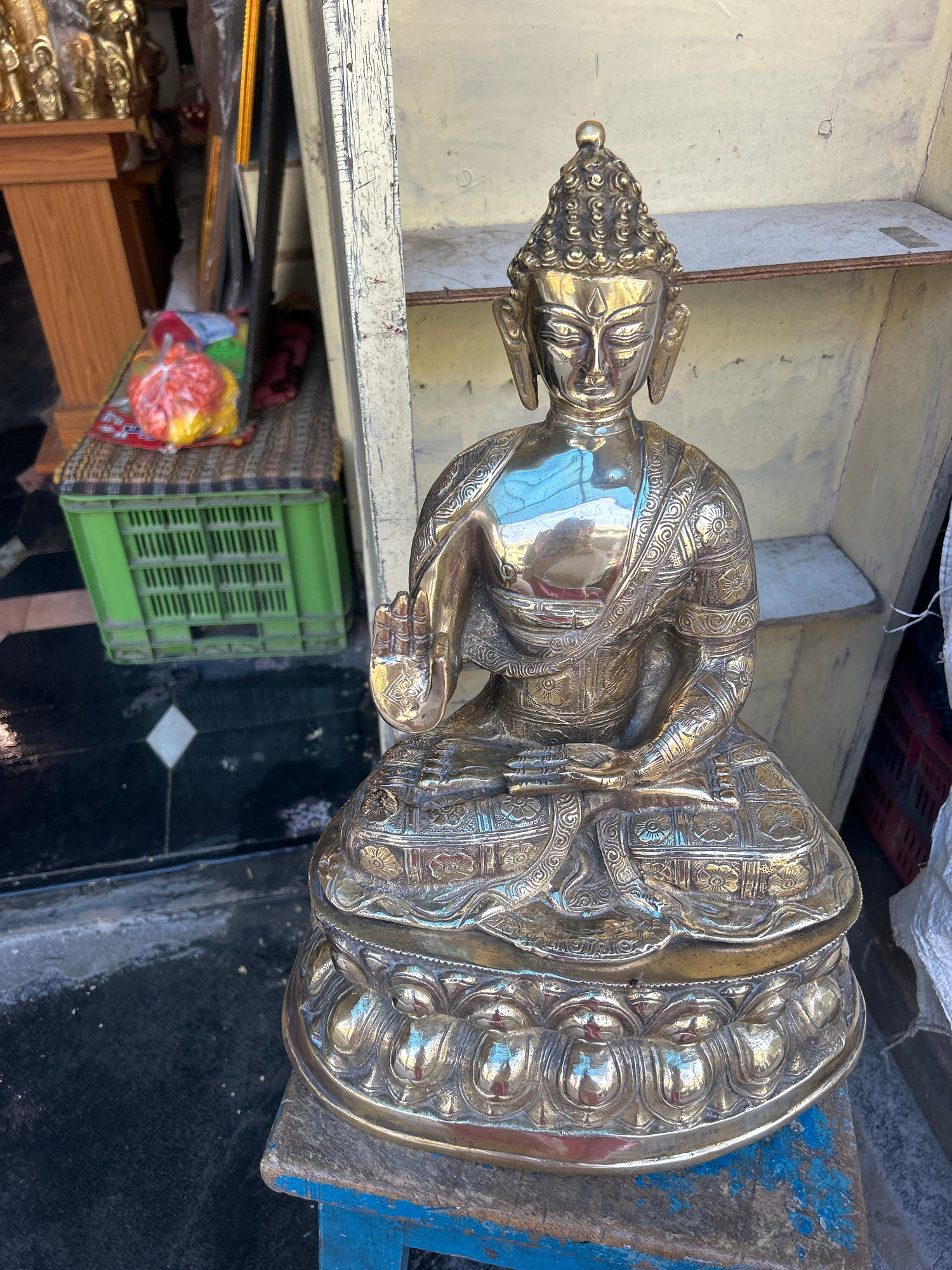 The image depicts a metal Buddha statue in Puttaparthi, India, resting on a wooden surface. The statue is intricately decorated, with detailed carvings throughout. The statue is positioned in a clutte…read more